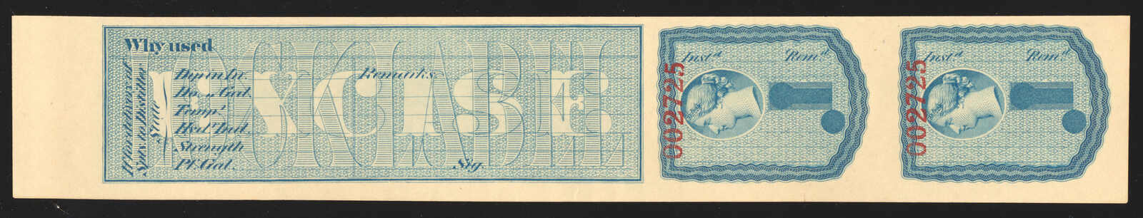 436 O FLS10a imageFederal Lock Seal, red Queen Victoria, booklet pane of two, used, with manuscript markings, bluish black serial numbers, typical condition for such used examples, which were used to seal locks on excise warehouses, very fine. (Image 1)