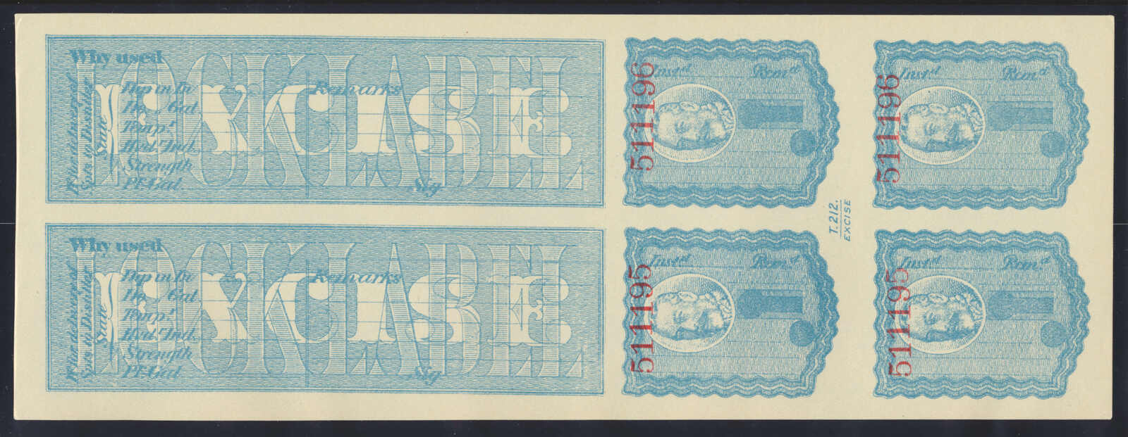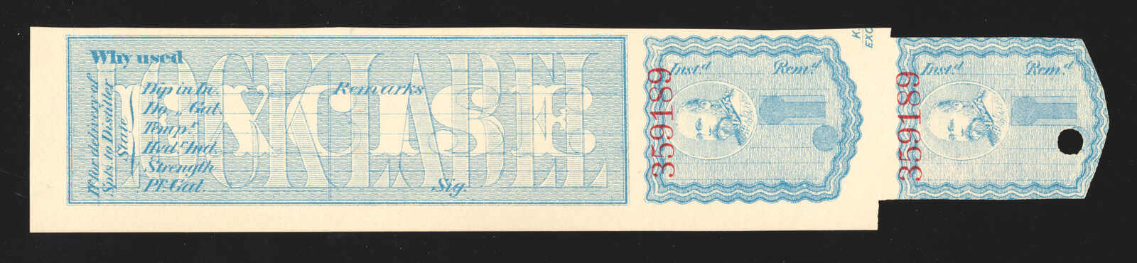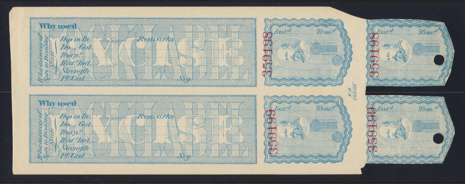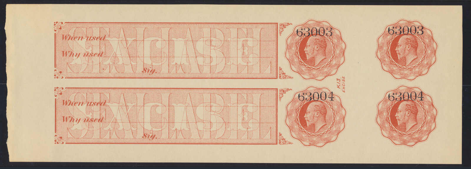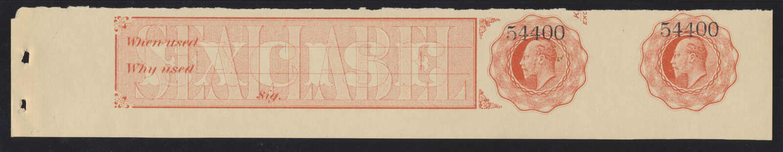 439 ng FLS12 imageFederal Lock Seal, red King Edward VII, “K13,” without gum as issued and bearing black serial numbers, showing two holes at one end from removal from the booklet, issued for use on the locks of excise warehouses and distilleries, rare and very fine. (Image 1)