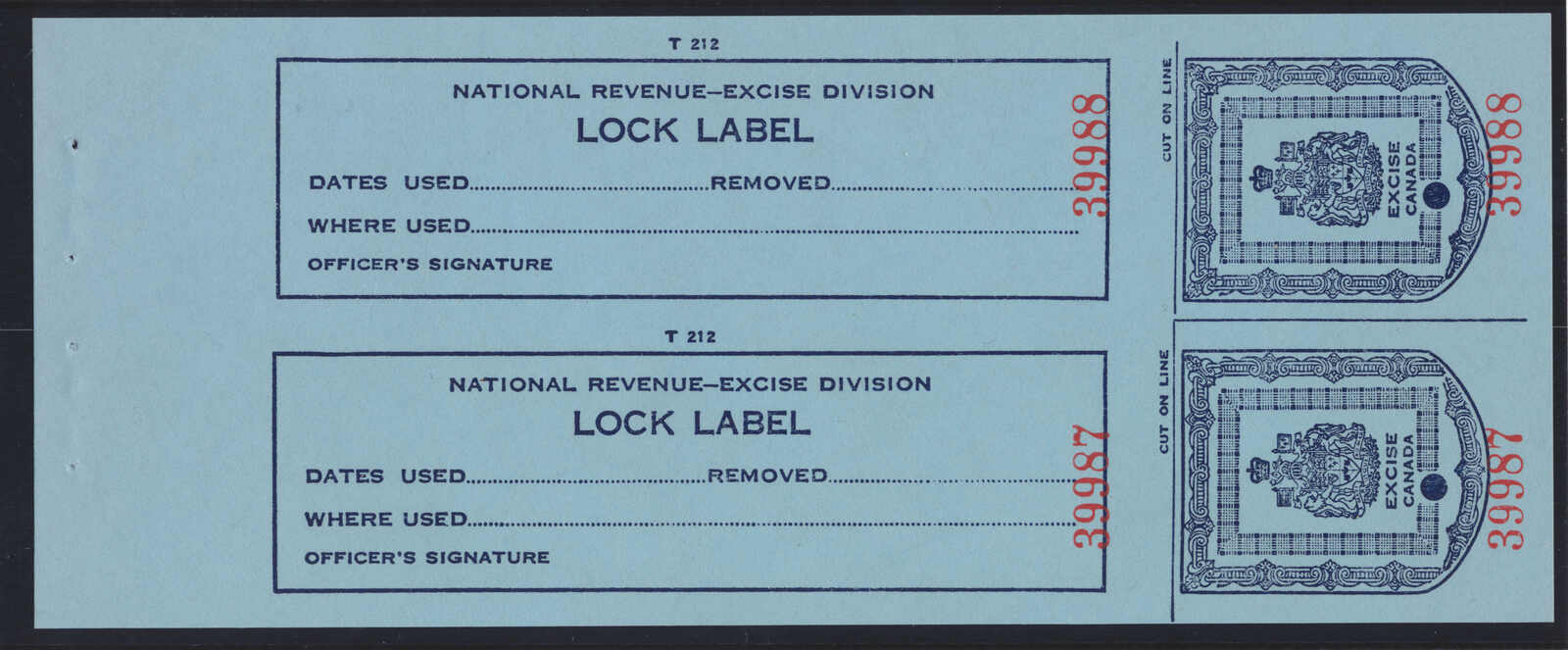 430 ng FLS6a imageFederal Lock Seal, blue King George V, “T.212,” booklet pane of two, without gum as issued and bearing red serial numbers, attractive pale colour, a rare pane, very fine. (Image 1)