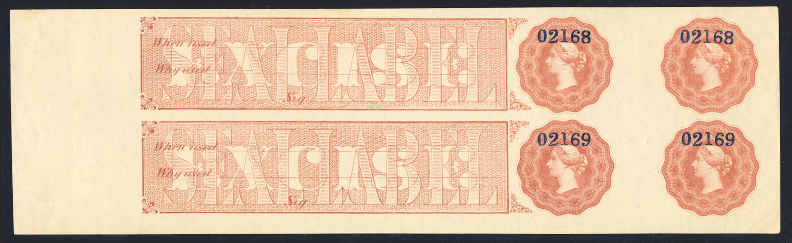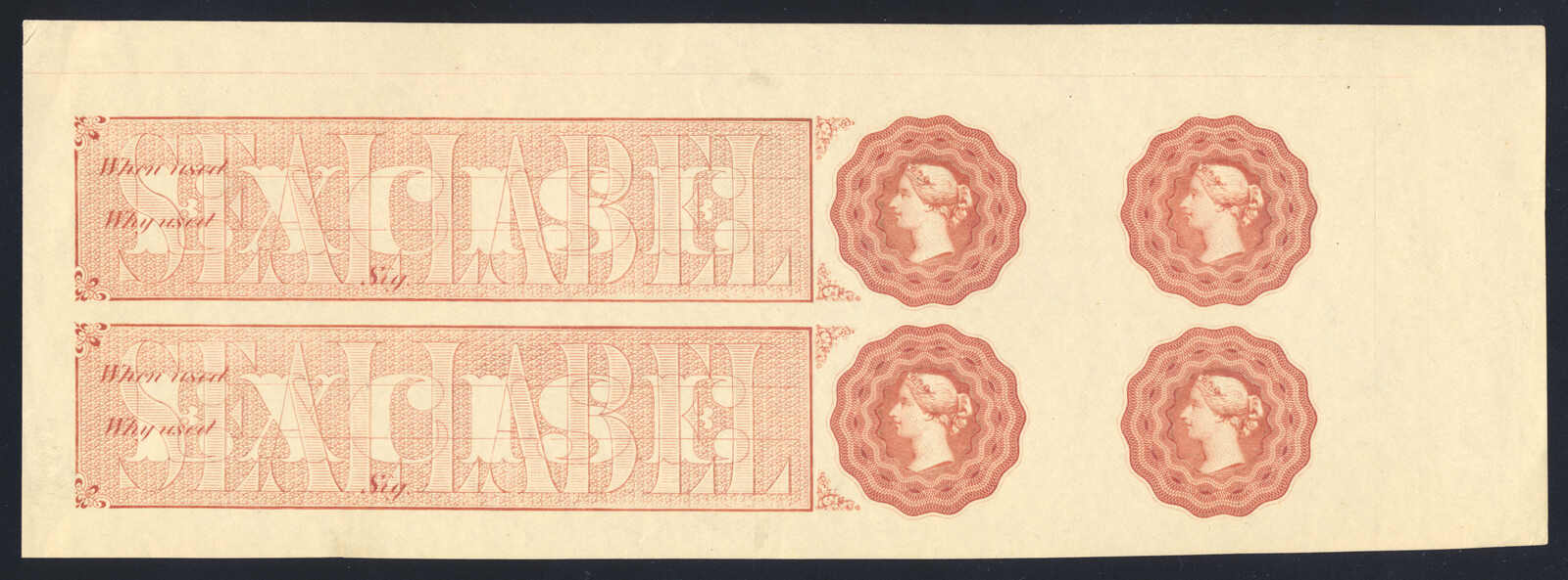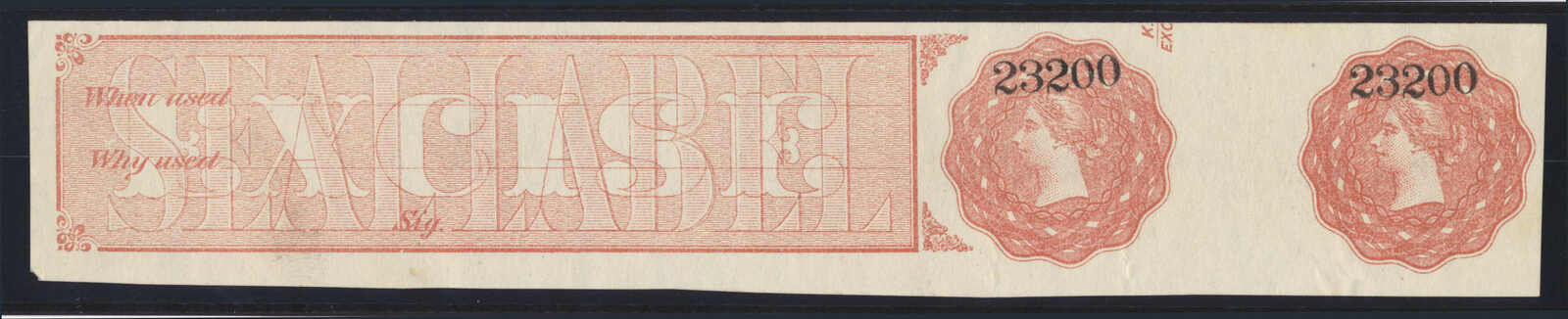 434 ng FLS10aP imageFederal Lock Seal, red Queen Victoria, proof booklet pane of two, without gum as issued, lacking the serial numbers of the issued examples, impressive bright colour, quite striking, a rare proof, very fine. (Image 1)