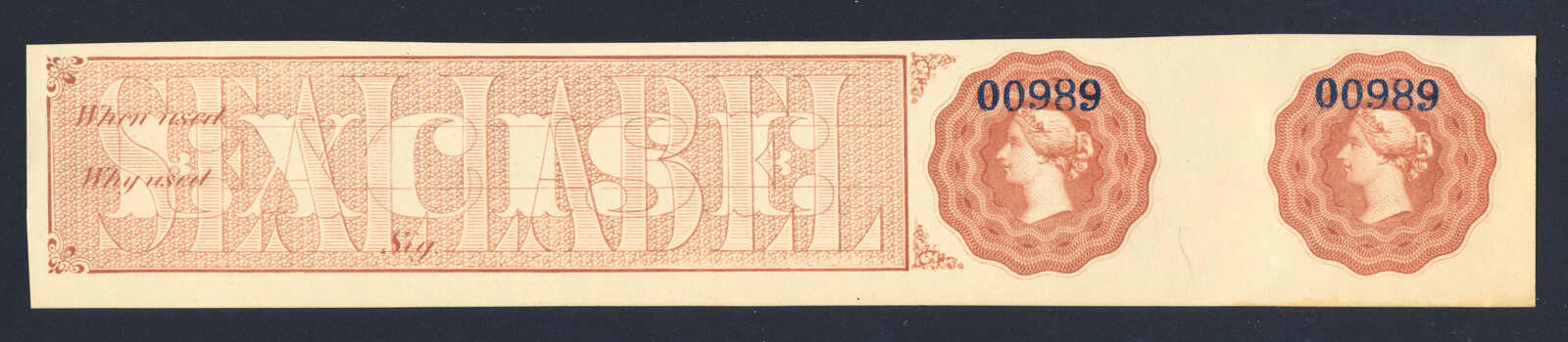 435 ng FLS10a imageFederal Lock Seal, red Queen Victoria, booklet pane of two, without gum as issued, serial numbers in bluish black, hinge remnants on reverse, of little importance given the elusive nature of these revenues, very fine. (Image 1)