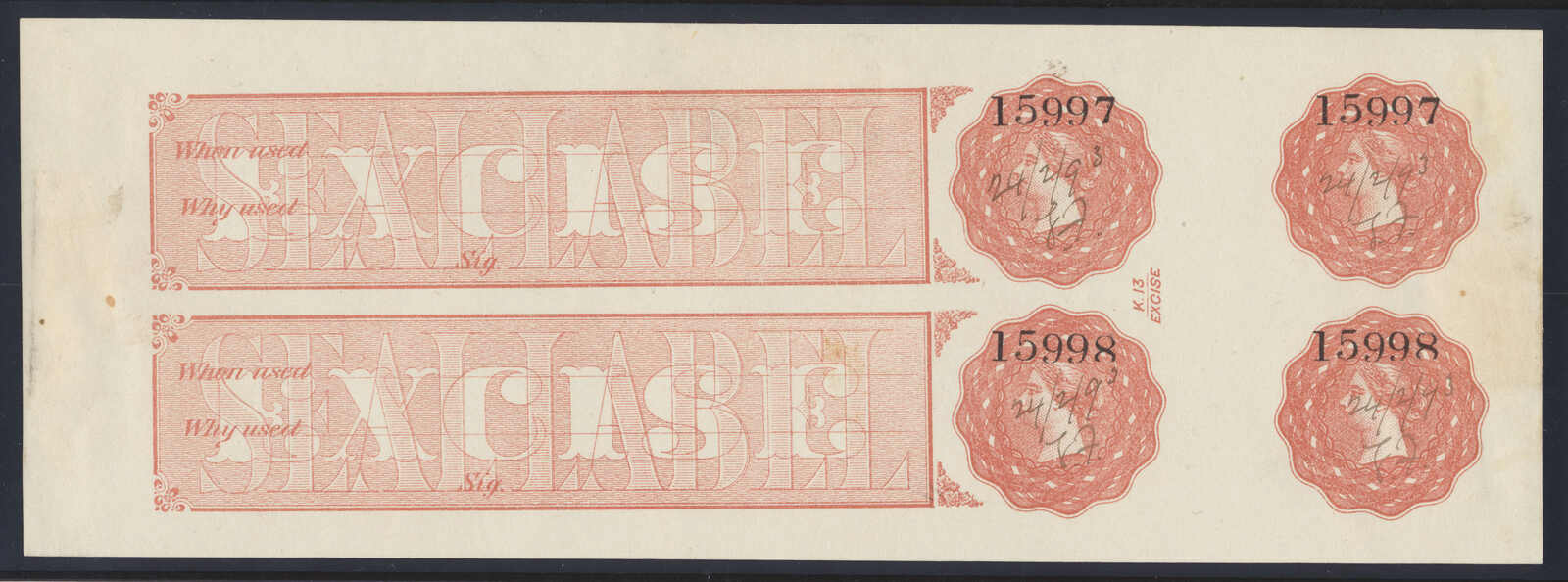 438 O FLS11 imageFederal Lock Seal, red Queen Victoria, “K,” booklet pane of two, used, with appropriate manuscript notations, black serial numbers, booklet panes unpriced in van Dam, missing from even many advanced collections, very fine. (Image 1)