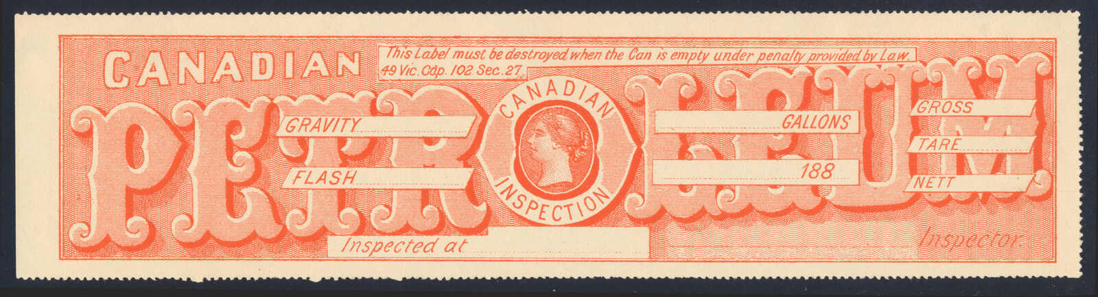 443 ng FPL3 image1886, Petroleum Label, vermilion Queen Victoria, perforated 12½, with two-line inscription at top, “188” in the year field and “Nett,” without gum as issued, intended for use on small metal petroleum cans, scarce and very fine. (Image 1)