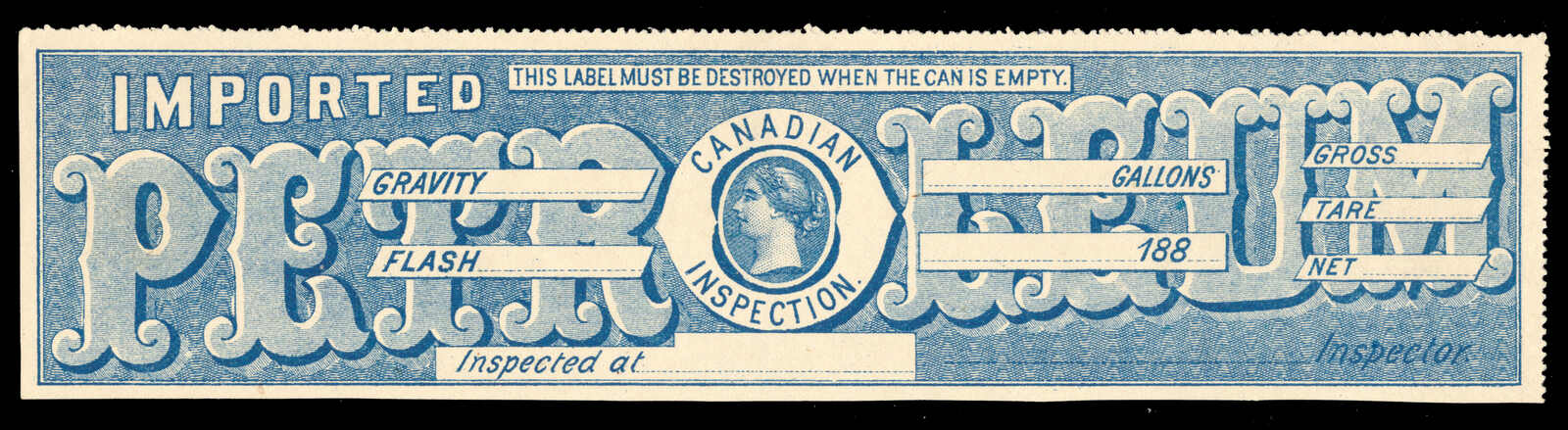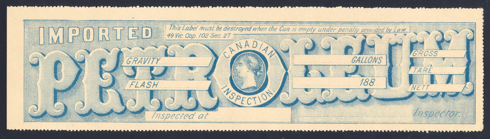 445 ng FPL4a image1886, Petroleum Label, dark blue Queen Victoria, perforated 12½, with two-line inscription at top, “188” in the year field and “Nett,” without gum as issued, attractive and very fine. (Image 1)