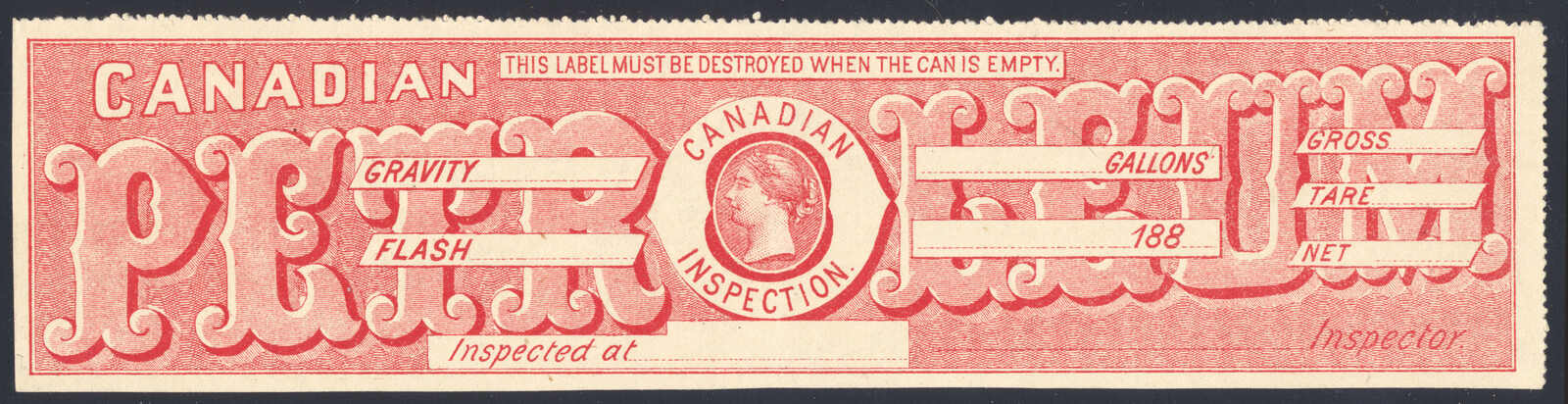441 ng FPL1 image1886, Petroleum Label, carmine Queen Victoria, perforated 12½, with single-line inscription at top, “188” in the year field and “Net,” without gum as issued, intended for use on small metal petroleum cans, typically under five gallons, rare and very fine.