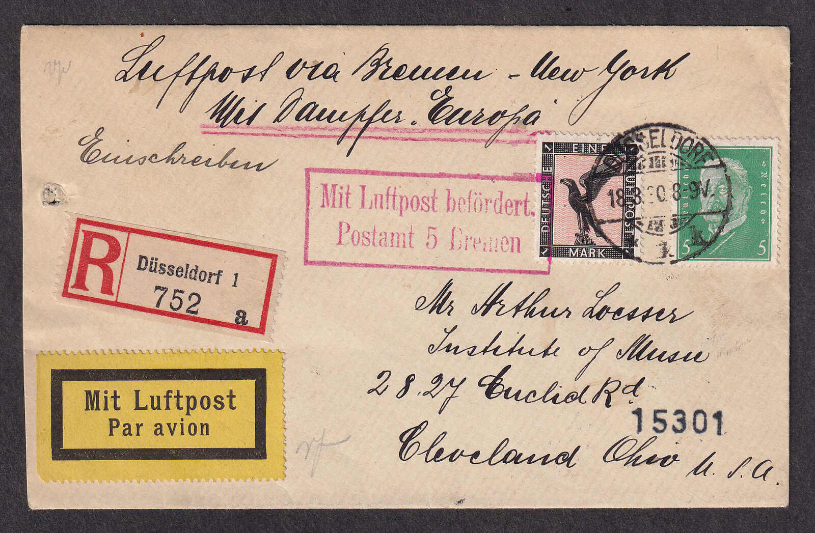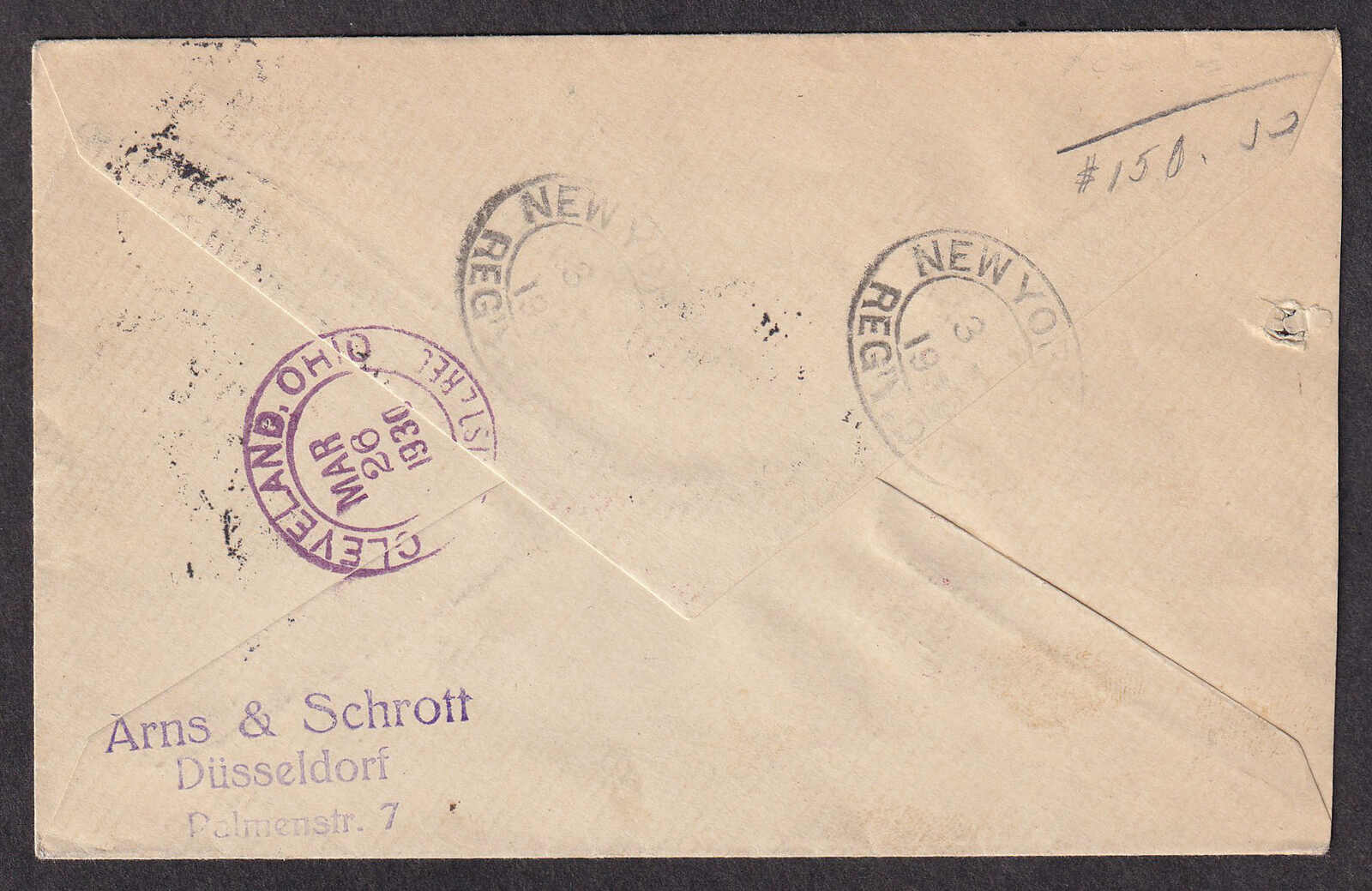 178 CVR   image1930 (March 18), registered DO-X First Flight cover, Bremen to New York, adhesives tied by Dusseldorf despatch c.d.s., framed rose "Mit Luftpost befordert / Postmant 5 Bremen", carried thence on the first DO-X trip from Bremen to New York, then onto Cleveland, with c.d.s. arrival backstamp (26 Mar), fresh and very fine. (Image 1) (Image 2)