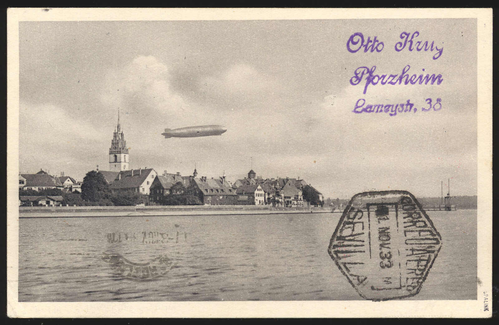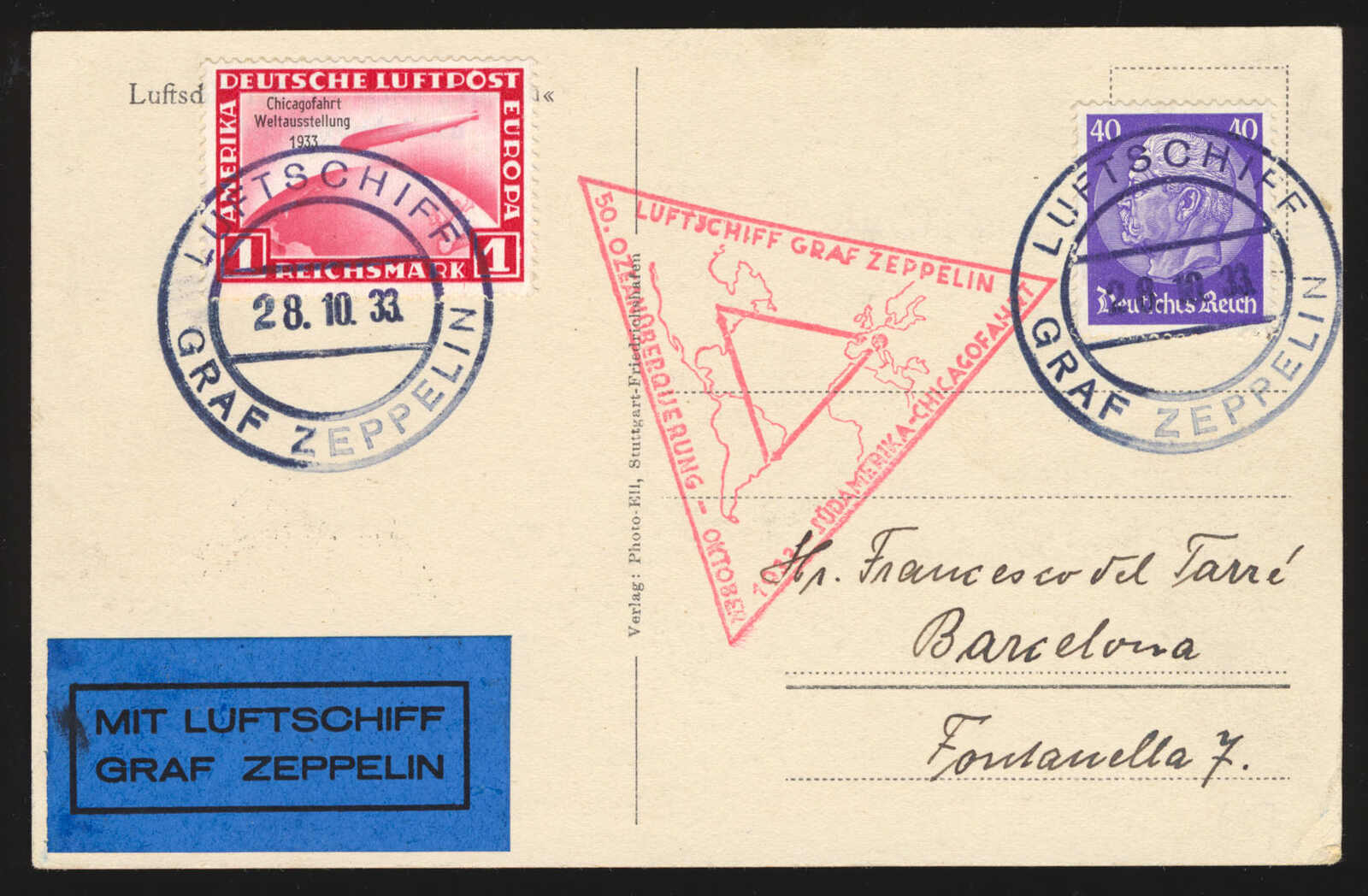 180 CVR   image1933 (October 28), Graf Zeppelin Chicago Flight on-board cancellation postcard to Barcelona, postcard depicting the Graf Zeppelin in flight, franked with 40pf Hindenburg and 1M Graf Zeppelin Chicago Flight, each tied by Luftschiff Graf Zeppelin on-board c.d.s., neatly-struck triangular confirmation cachet, to Barcelona, Spain, with Seville arrival backstamp, lovely quality. (Mi. 354d, €750+) (Image 1) (Image 2)