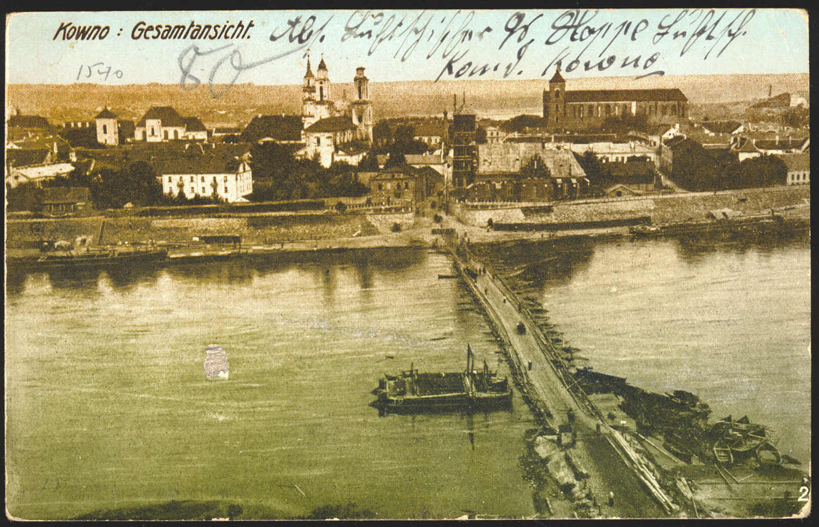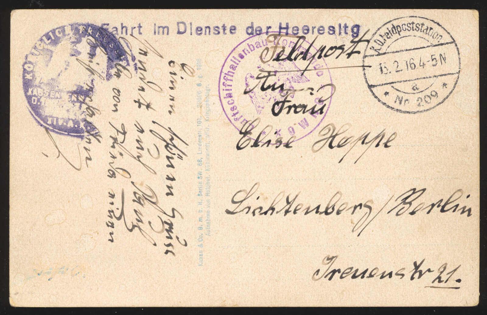 176 CVR   imageZeppelin Military Construction Detachment, 1916 (13 February), Feldpost card from Kowno to Berlin, official military service card headed Fahrt im Dienste der Heeresleitung, sent by a soldier of the Luftschiffhallenbau-Kommando (Airship Hangar Construction Command) at Kowno, struck with a clear black Feldpoststation Nr. 209(13/2/16) circular datestamp, violet oval cachet Luftschiffhallenbau-Kommando Kowno, and violet circular seal of the Königlich Preußisches XIV. Armeekorps, picture side showing a contemporary view of Kowno, a fine and scarce Feldpost item from a Zeppelin construction detachment operating under the XIV Army Corps. (Image 1) (Image 2)
