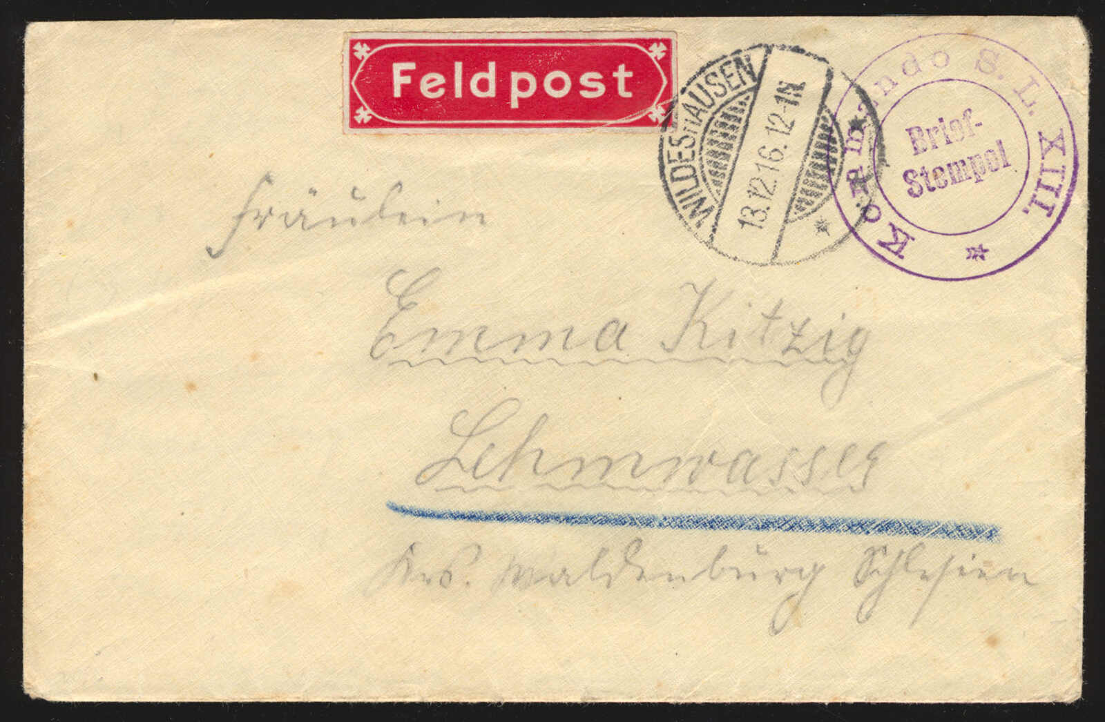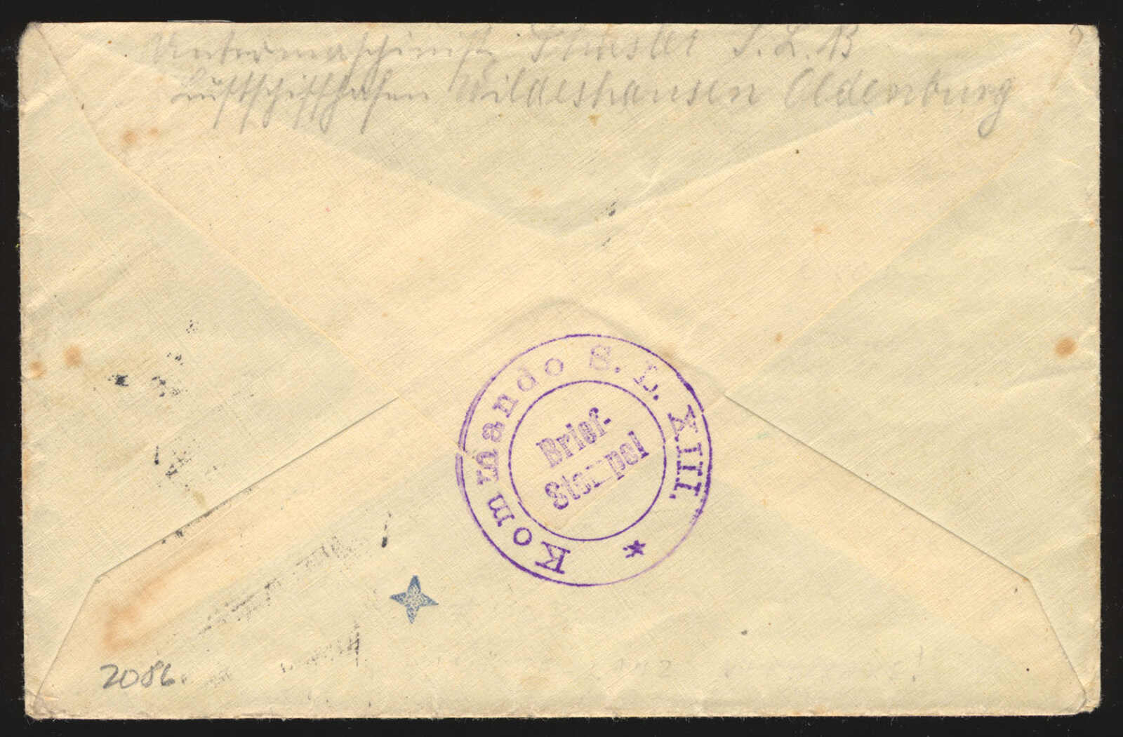 174 CVR   imageSchütte-Lanz SL-13, 1916 (13 December), feldpost cover from Wildeshausen to Lehnwasser, military envelope with red Feldpost label at upper left, cancelled Wildeshausen and struck front and back with the violet circular cachet Kommando S.L. XIII / Brief-Stempel, the sender (unnamed) indicating service with the Wildeshausen airship station attached to Schütte-Lanz SL-13, a German Army rigid airship of the Schütte-Lanz series that served only briefly from October 1916 before withdrawal to Leipzig and destruction in an explosion; surviving postal material from SL-13 is notably scarce. (Image 1) (Image 2)