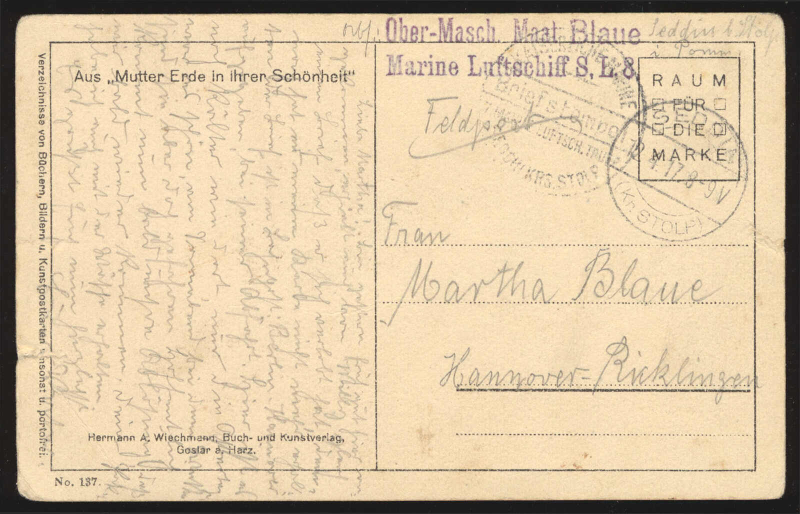172 CVR   imageSchütte-Lanz S.L.8, 1917 (12 April), feldpost postcard from Seddin (Kreis Stolp) to Hannover, written by Ober-Masch. Maat Blaue, crewman of the Kaiserliche Marine airship S.L.8, endorsed Feldpost and cancelled Stolp i. Pom. in black, with a fine violet circular unit handstsm "Kaiserliche Marine / Marine-Luftschiff-Trupp / Briefstempel / Seddin Krs. Stolp" and the sender’s two-line violet handstamp, light corner crease, but a scarce naval airship usage from the smaller Seddin station. (Image 1) (Image 2)