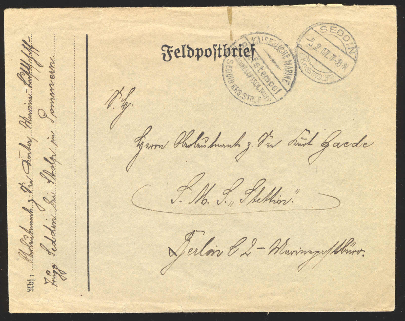 171 CVR   imageMarine-Luftschiff-Abteilung, 1917 (February 3), Seddin (Pommern) to Berlin, feldpost cover dispatched from Seddin bei Stolp by Leutnant der Reserve F. Fielitz, Marine Luftschiffer, attached to a Marine Zeppelin detachment, cancelled by clear double-ring Seddin (Kr. Stolp) 3.2.17 c.d.s. in black with violet circular unit cachet Kommando der Kaiserlichen Marine / Briefstempel / 7. Marine-Luftschifftruppe / Seddin Krs. Stolpalongside, endorsed “S.M.L. ‘Stettin’,” a fine usage from an airship base. (Image 1) (Image 2)