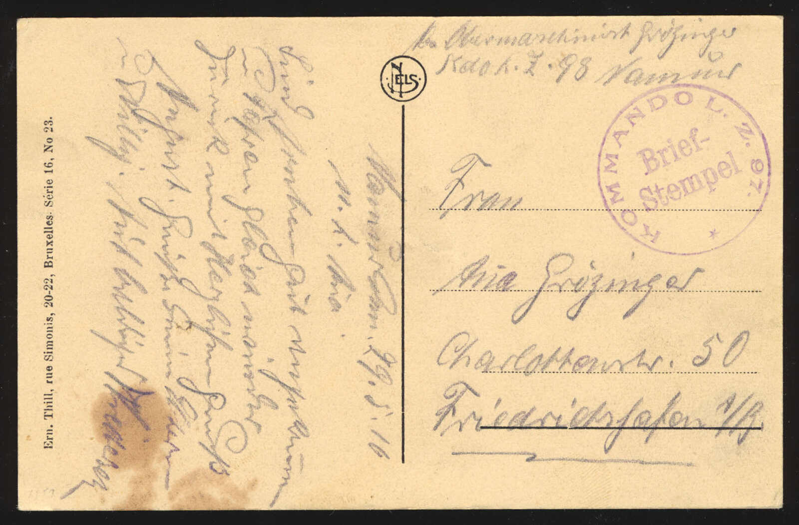 161 CVR   imageLZ 98, 1916 Commander’s postcard from Namur with Kommando LZ-97 cachet, to Friedrichshafen, picture postcard of the Namur Citadel written 29.5.16 and addressed to Friedrichshafen, the manuscript sender line reading “Der Kommandeur Luftschiff Z.98, Namur,” struck at right with the violet circular Kommando L.Z.97 / Brief-Stempel cachet, an interesting example of inter-unit handling between the two Zeppelins, the LZ-98, commissioned April 1916, and LZ-97, commissioned the same month and active in raids over England, the Western Front, and Romania, stain at lower left, else very fine. (Image 1) (Image 2)