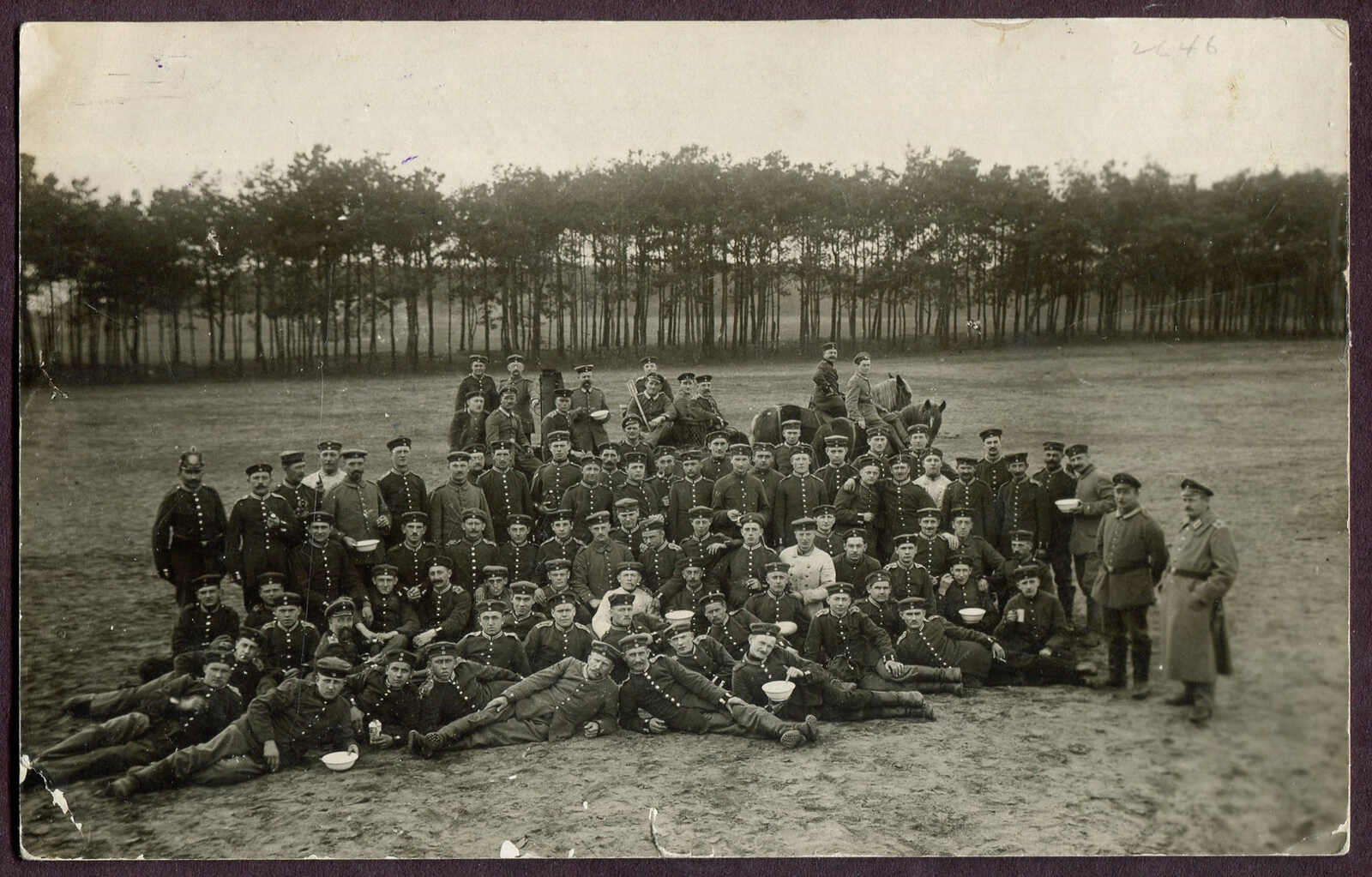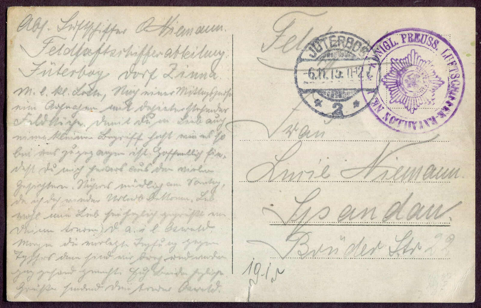 175 CVR   imageZeppelin Detachment, 1915 (November 6), feldpost from Jüterbog to Spandau, real photo postcard showing a full group portrait of Zeppelin detachment personnel, endorsed Feldpost and cancelled Jüterbog, with violet circular cachet "Königl. Preuss. Luftschiffer-Ersatz-Abteilung Nr. 1," the sender identifying himself as an airman of this Zeppelin reserve unit, unusually select quality, very fine; the Luftschiffer-Ersatz-Abteilung at Jüterbog served as the principal training and replacement formation for Germany’s airship and balloon troops, supplying crews to frontline Zeppelin commands. (Image 1) (Image 2)