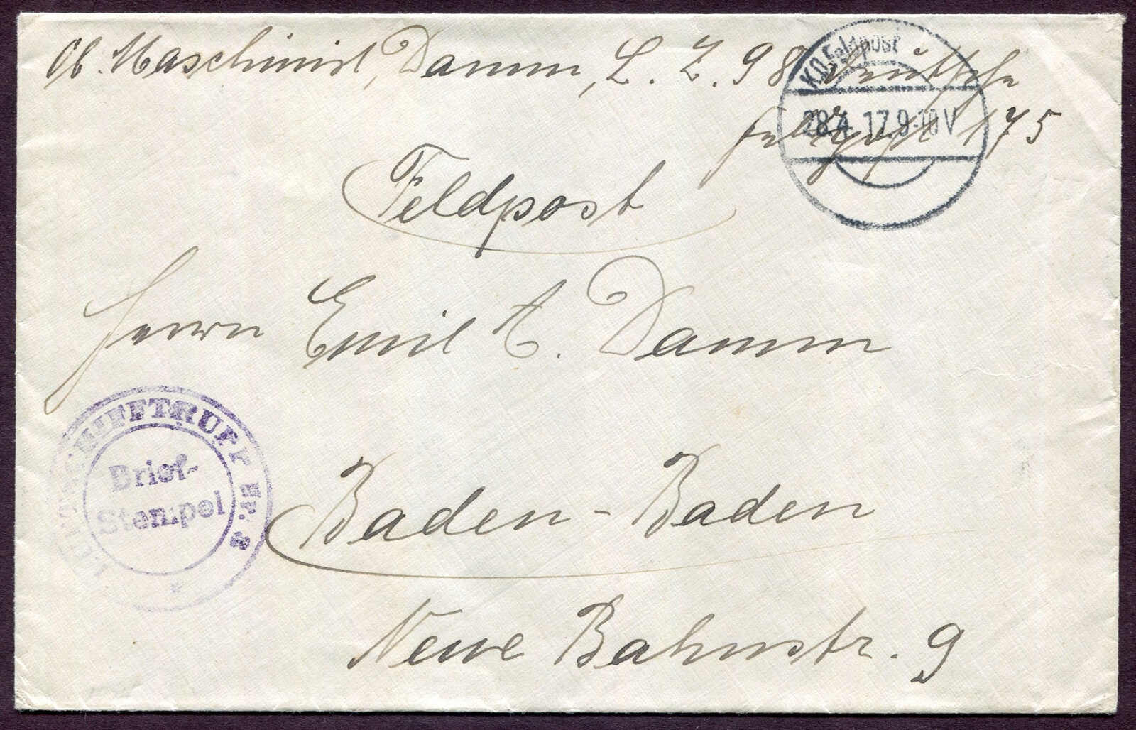 162 CVR   imageLZ 98, 1917 (April 28), feldpost cover from an airship machinist to Baden-Baden, envelope endorsed Feldpostand, written by Offizier-Maschinist Damm of Kommando L.Z.98 (manuscript sender line at upper left), struck with a violet circular "Luftschifftrupp Nr. 3 / Dienst-Stempel" alongside a clear K.D. Feldpost c.d.s. in black, fresh and very fine; the LZ-98 was commissioned on 28 April 1916, and was active in raids over England, reconnaissance in the East, and Western Front operations until decommissioning in July 1917. (Image 1)