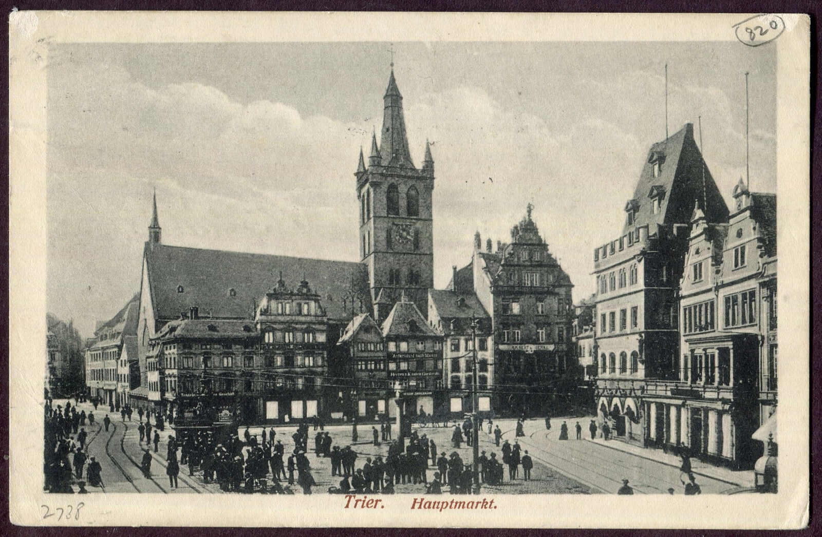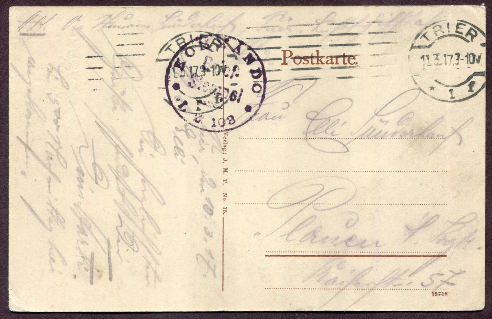 164 CVR   imageLZ 103, 1917 (March 11), picture postcard from Trier to Plauen, cancelled by Trier c.d.s. with a violet unit cachet alongside, the card a view of the Hauptmarkt at Trier, written the previous day (10 March) and addressed to Plauen, the sender’s manuscript details at upper left giving rank and surname, apparently reading “Oblt. [Lindhorst?], per Luftschiffe,” identifying the writer as an airship officer, fresh and very fine; the LZ-103, commissioned 16 August 1916 and employed chiefly in attack operations on the Western Front, crashed at Königsberg on 14 August 1917, ending an active service life of only one year. (Image 1) (Image 2)