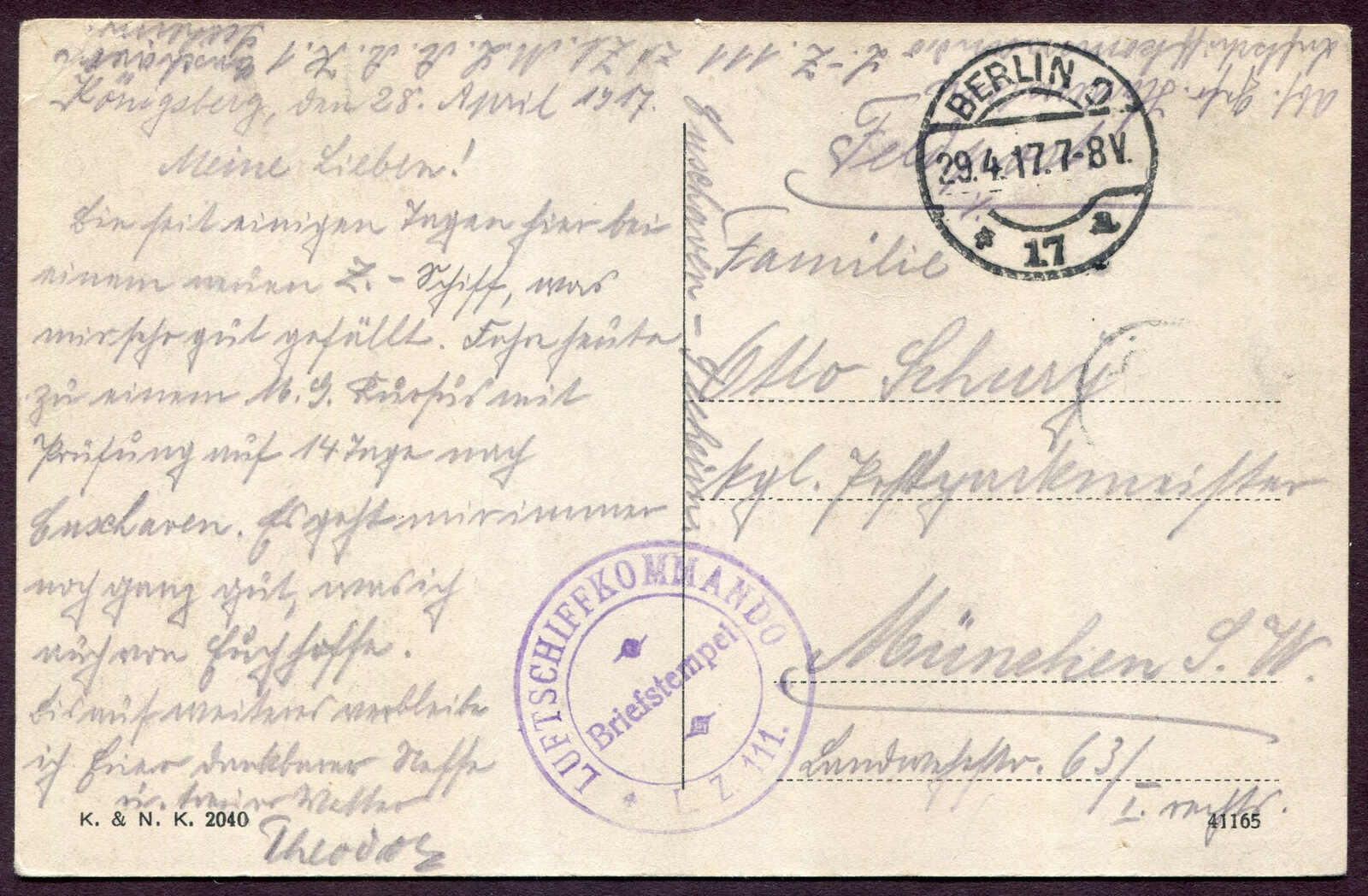 165 CVR   imageLZ 111, 1917 (April 29), picture postcard from Berlin, crew-mailed feldpost, struck with a clear violet circular Luftschiff Kommando L.Z.111 / Briefstempel alongside a Berlin c.d.s., the sender identifying himself in the upper margin as “Absender: … Luftschiffkommando L.Z.111” and signing the message “Theodor,” likely crewman or officer Theodor Hartmann (or Heimann) attached to the Zeppelin command of L.Z.111, trivial edge wear, else very fine; the L.Z.111, which completed no operational flights for the Army and was transferred to the Navy in the summer of 1917 for reconnaissance over the Ostsee, survived barely seven months before crashing at Dresden on 1 August 1917. (Image 1) (Image 2)