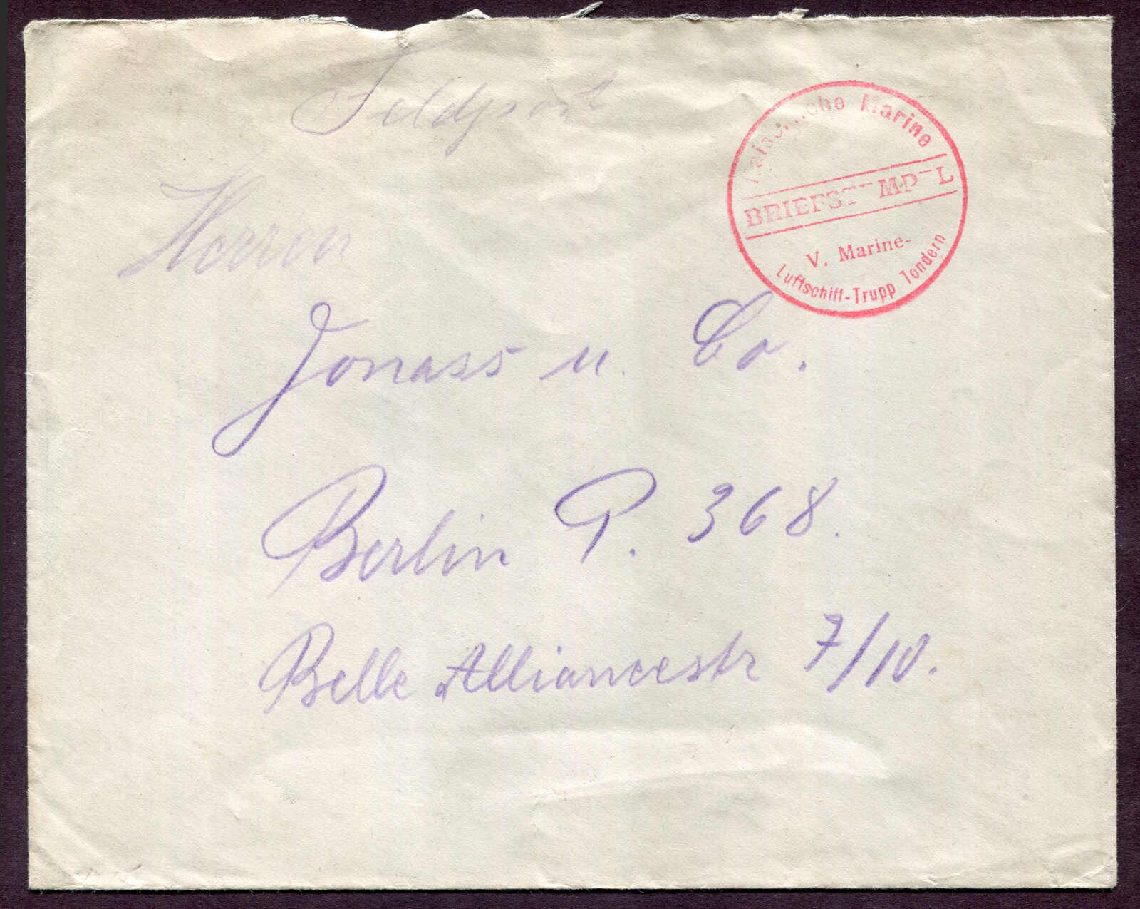 163 CVR   imageLZ 99, 1917, feldpost envelope from the Tønder naval Zeppelin base to Berlin, endorsed Feldpost and struck with a fine red circular "Kommando – V. Marine Luftschiff-Trupp Tondern" cachet alongside violet manuscript, the reverse bearing the sender’s designation “R. Westphal, Ob. Maschinist, Marine-Luftschiff L.54, Tondern,” identifying him as a senior machinist aboard the LZ 99, fresh and very fine; LZ 99, commissioned 13 August 1917 and active in reconnaissance and attack roles from Tønder, was destroyed less than a year later on 19 July 1918 when British aircraft carried out the famed Tondern Raid, the world’s first successful carrier-launched airstrike. (Image 1) (Image 2)