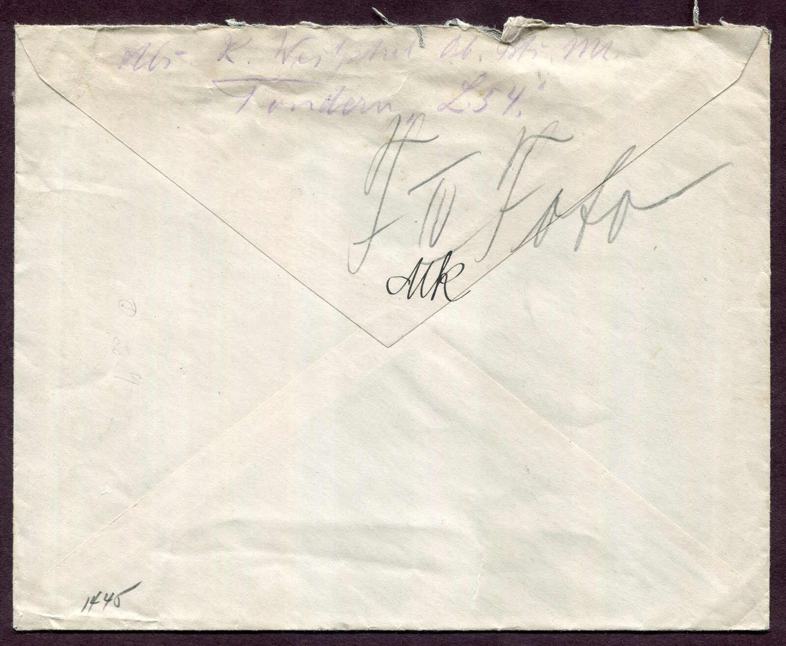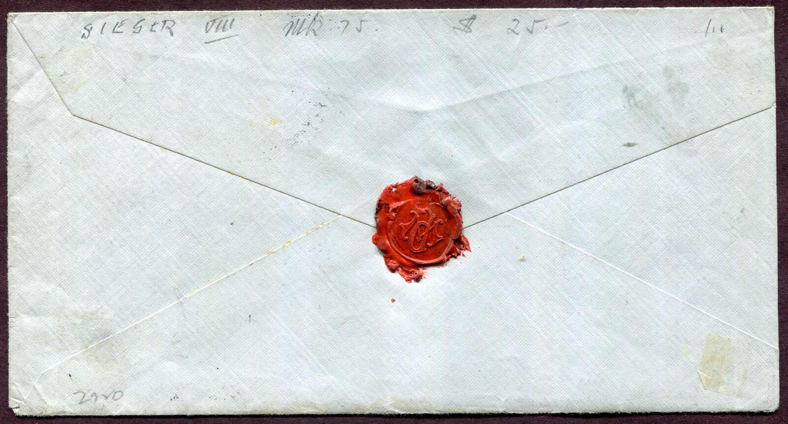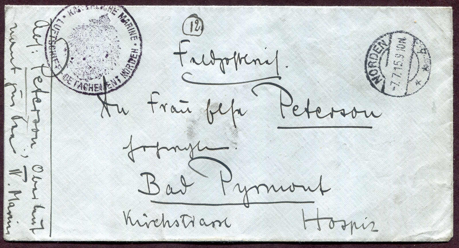 169 CVR   imageMarine-Luftschiff-Abteilung Norden, 1915 (July 7), feldpost cover to Bad Pyrmont, struck with the violet circular "Kaiserliche Marine / Luftschiff Detachement Norden" cachet alongside a clear Norden c.d.s., the sender’s endorsement at left reading “Oblt. Peterson, K. Marine,” the reverse with intact red wax seal, very fine; Peterson, then serving with the naval Zeppelin detachment at Norden, would later become commander of the naval airship L-32, shot down and destroyed during a raid over London on 24 September 1916 by 2nd Lt. Frederick Sowrey of the RFC, making this an evocative piece of correspondence linked to a future Zeppelin commander who perished in action. (Image 1) (Image 2)