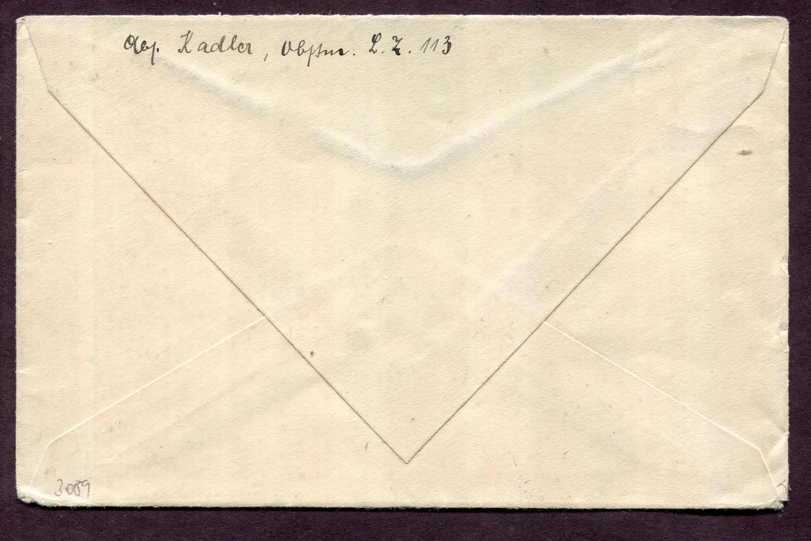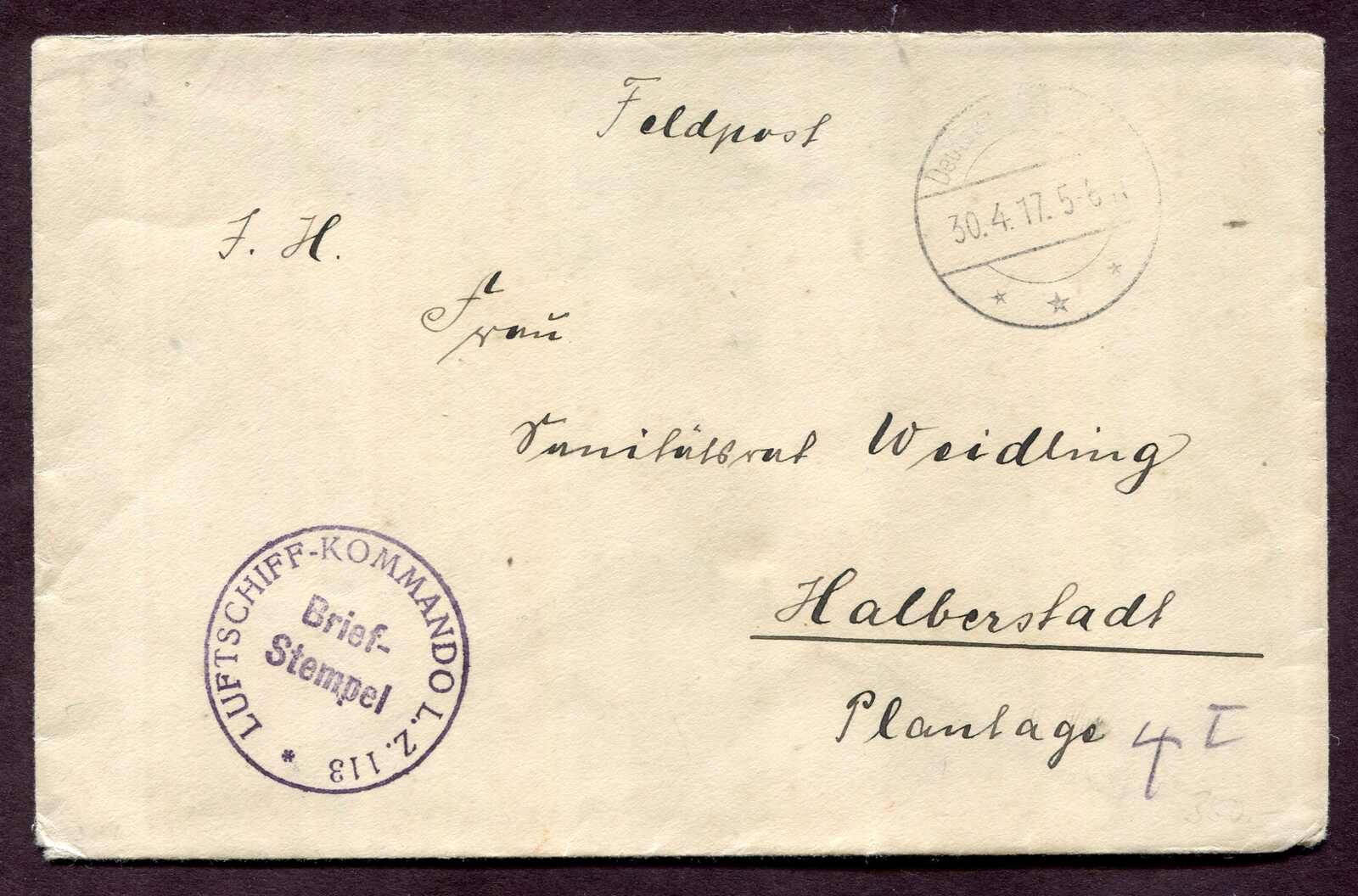 166 CVR   imageLZ 113, 1917 (April 30), officer's feldpost cover to Halberstadt, endorsed Feldpost and struck with the circular violet Luftschiff-Kommando L.Z. 113 / Brief-Stempel alongside a clear feldpost c.d.s., the reverse bearing the sender’s manuscript “Oblt. Kadler, Obflpm. L.Z. 113,” an officer attached to the Zeppelin, a choice strike of this Zeppelin handstamp on a remarkably fresh cover1, ; the LZ 113, placed into service on 22 February 1917 and completing no operational army flights before its transfer to the navy in May 1917 for reconnaissance duties over the Ostsee, was handed over to France after the war in October 1920, where it made several unsuccessful flights prior to crashing. (Image 1) (Image 2)