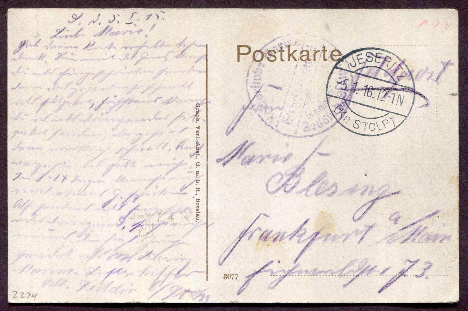 170 CVR   imageMarine-Luftschiff Station Seddin, 1916 (January 5), picture postcard from Jeseritz to Frankfurt a/M, cancelled by a clear Jeseritz feldpost c.d.s. in black with a faint but significant violet circular "Kaiserliche Marine / Briefstempel / Marine-Luftschiff-Station Seddin b. Stolp" alongside, the message written in violet pencil on 3 January opening signed by a Luftschiffer, the station cachet confirming the sender’s attachment to the naval Zeppelin detachment at Seddin, fresh and very fine; Seddin, near Stolp in Pomerania was established in late 1915 as a major Imperial German Navy airship base for reconnaissance and patrols over the Ostsee. (Image 1) (Image 2)