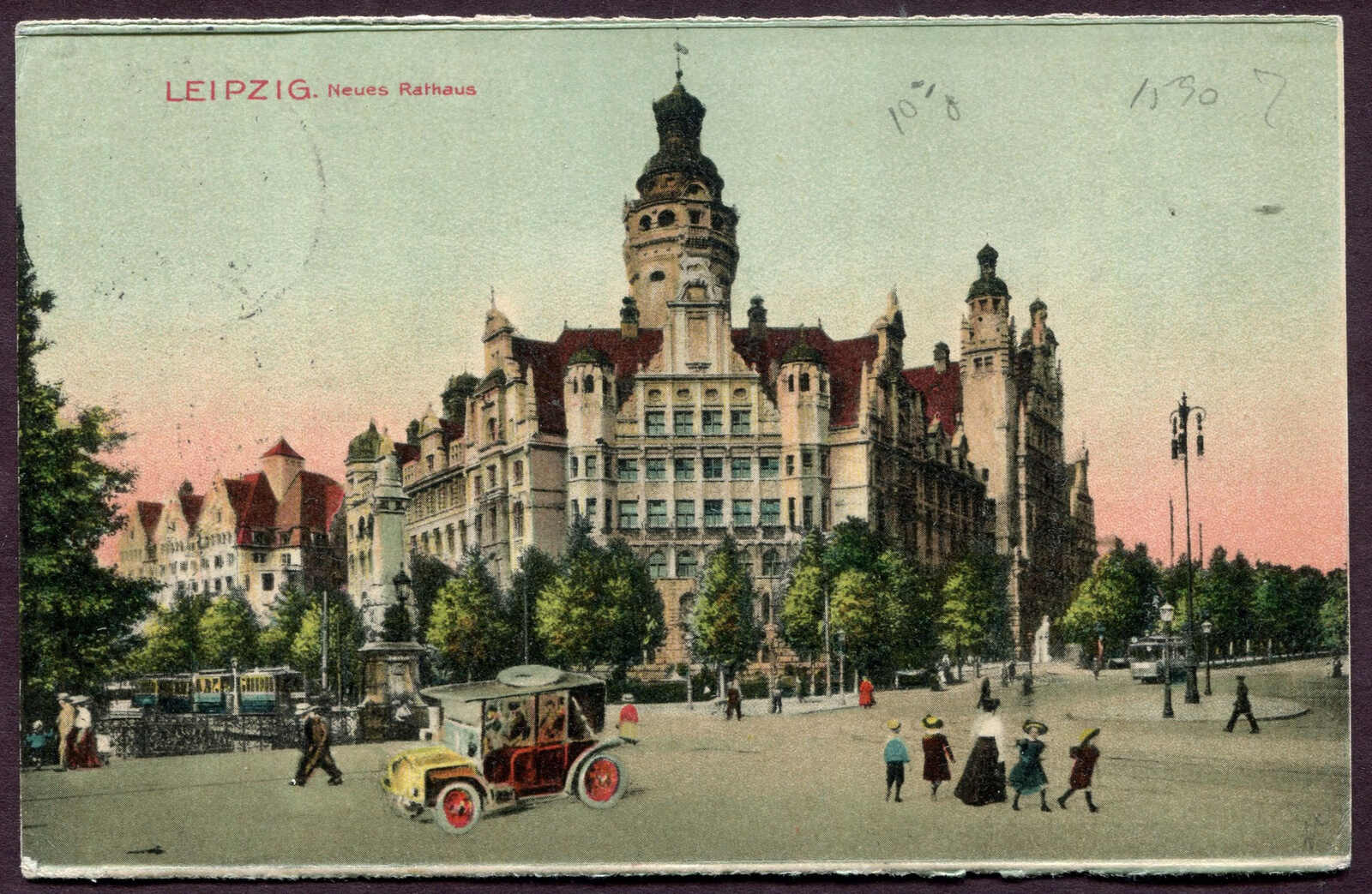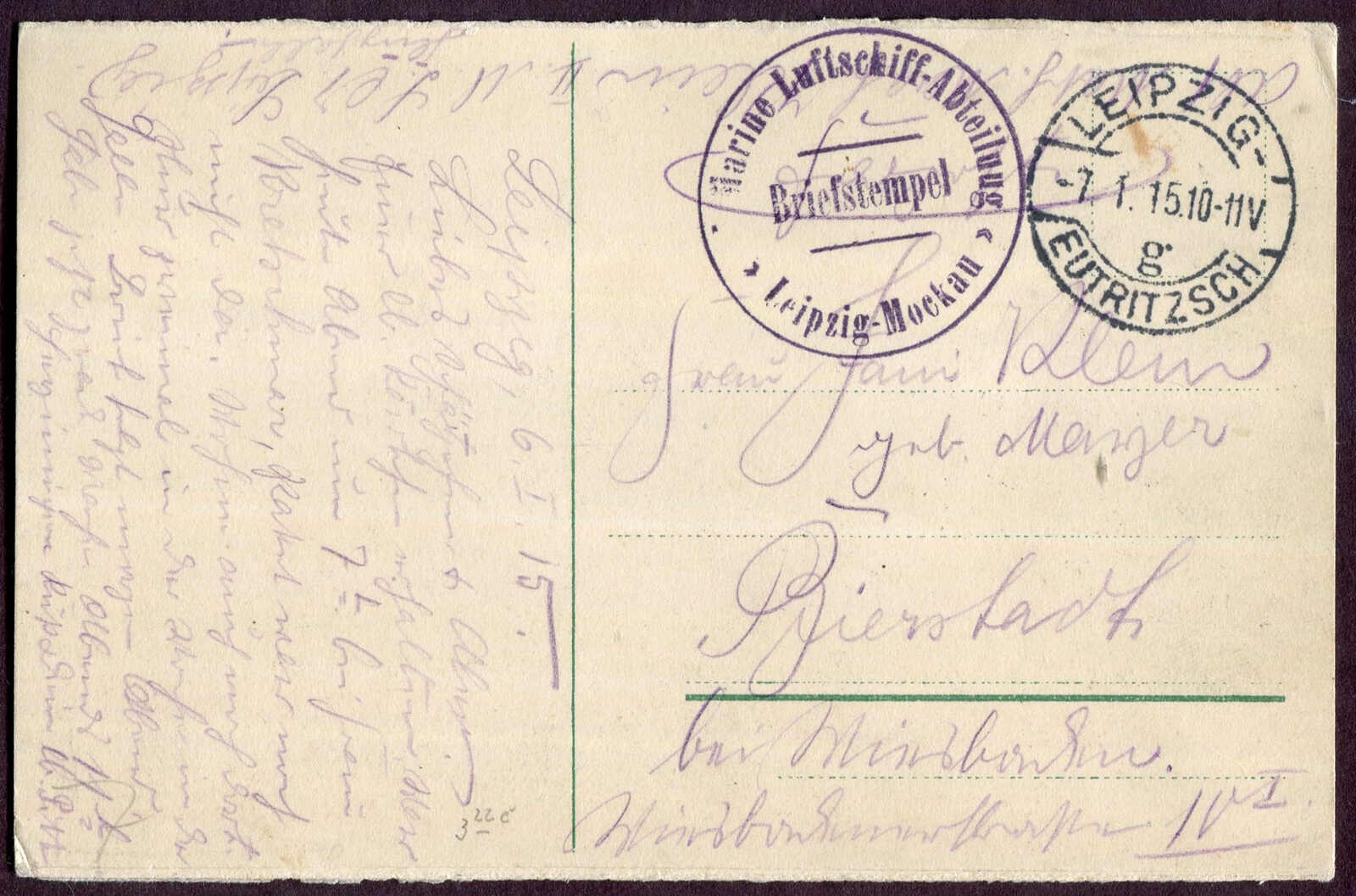 168 CVR   imageMarine Luftschiff-Abteilung Leipzig-Mockau, 1915 (July 1), feldpost picture postcard to Biersbach, showing a view of Leipzig (Neues Rathaus) and bearing the violet circular "Marine Luftschiff-Abteilung / Leipzig-Mockau / Briefstempel alongside" a Leipzig-Eutritzsch machine cancel of the same date, the sender identifying himself as “Abs: Klein, II. Komp. Leipzig-Mockau,” the handwritten message dated 6 May 1915 and signed “Klein” with a possible second signature, fresh and very fine, with superb quality strikes; mail from Leipzig-Mockau, one of the major German naval Zeppelin bases of the First World War, is quite elusive. (Image 1) (Image 2)