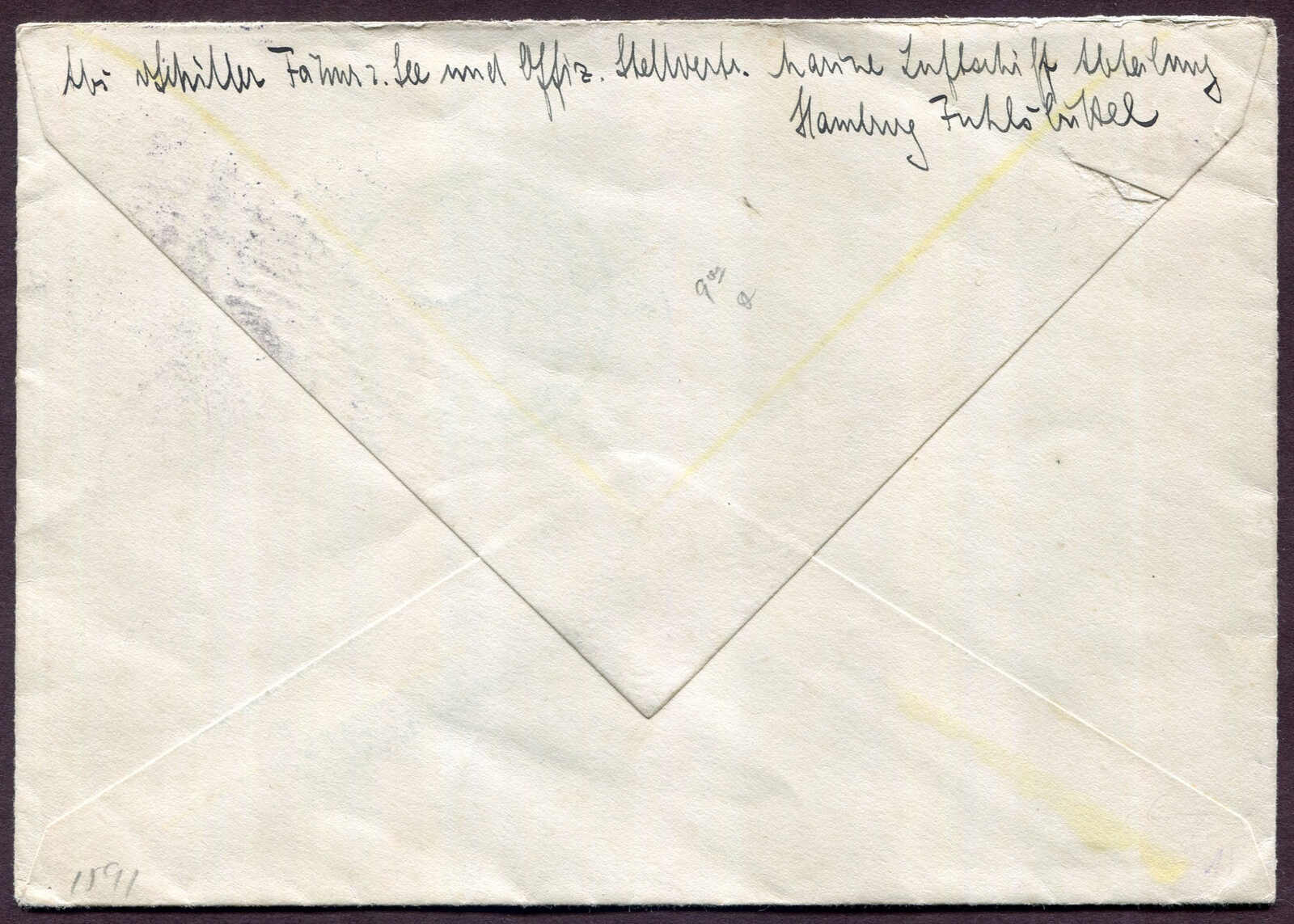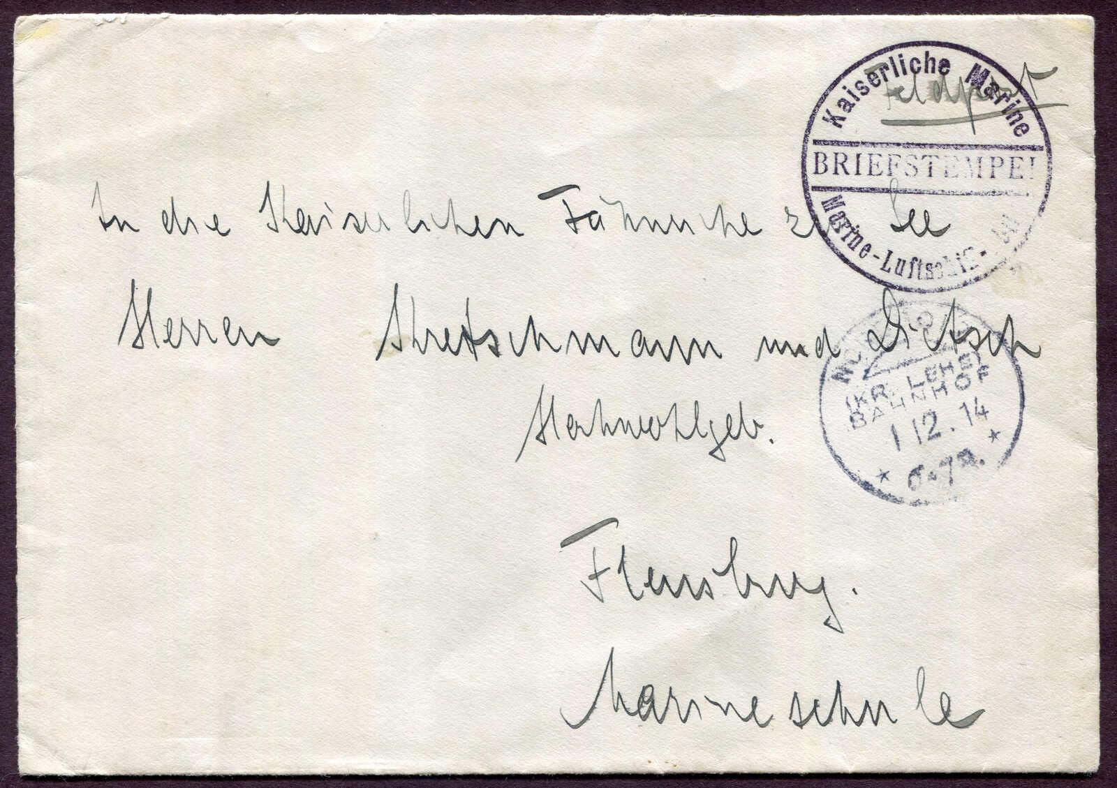 167 CVR   imageMarine-Luftschiff-Abteilung Hamburg-Fuhlsbüttel, 1914 (December 1), naval Zeppelin feldpost cover to the Marine School at Flensburg, struck with a Kgl. Bahnhof railway cancel alongside a bold violet "Kaiserliche Marine / Briefstempel / Marine-Luftschiff", the reverse showing the sender’s return address “Abs. [Schiller?], Marine-Luftschiff-Abteilung Hamburg-Fuhlsbüttel,” sent from the Imperial Navy Zeppelin detachment at this early operating base prior to the establishment of Nordholz, fresh and very fine, a scarce early-war Zeppelin-related 1914 example from the formative months of German naval airship operations. (Image 1) (Image 2)