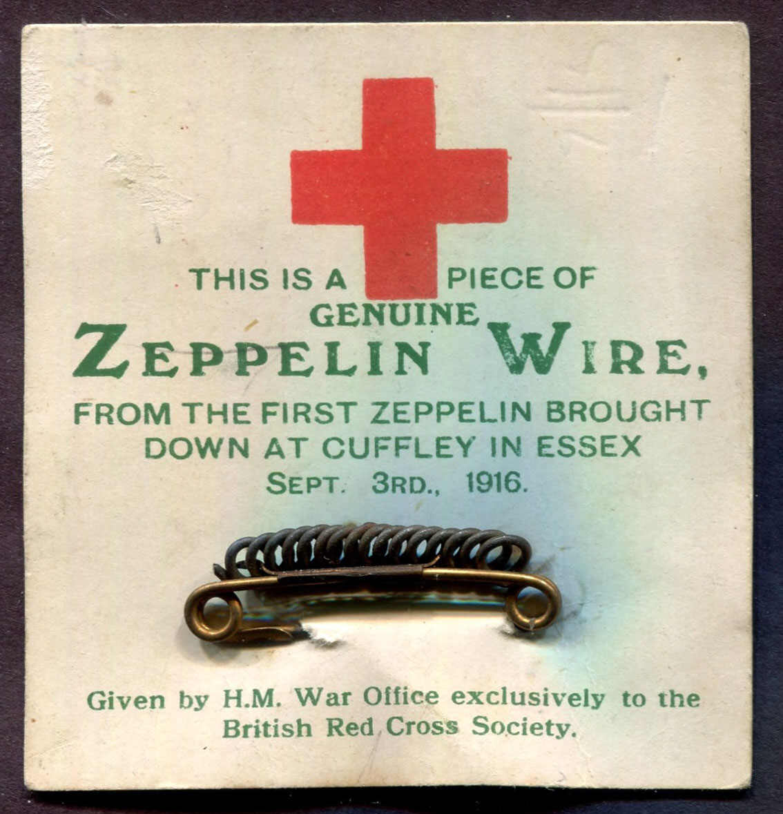 173 CVR   imageSchütte-Lanz SL 11, 1916 (September 3), genuine Zeppelin relic from the “Cuffley Zeppelin,” a piece of aluminium wire mounted to the original British Red Cross souvenir card printed with red cross and legend This is a piece of genuine Zeppelin wire, from the first Zeppelin brought down at Cuffley in Essex, Sept. 3rd 1916. Given by H.M. War Office exclusively to the British Red Cross Society, the War Office–issued card part of an official fundraising effort commemorating the destruction of SL 11 by 2nd Lt. William Leefe Robinson VC during the night raid of 3 September 1916, fresh and very fine; an authentic wartime souvenir of the first rigid German airship destroyed over Britain, the dramatic fall of the “Cuffley Zeppelin” marking a pivotal moment in the home-front air war and signalling the end of the invincibility myth that had surrounded the night raiders. (Image 1)