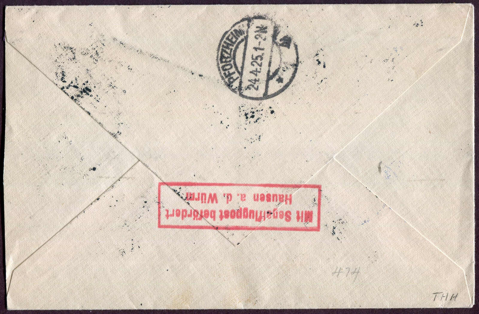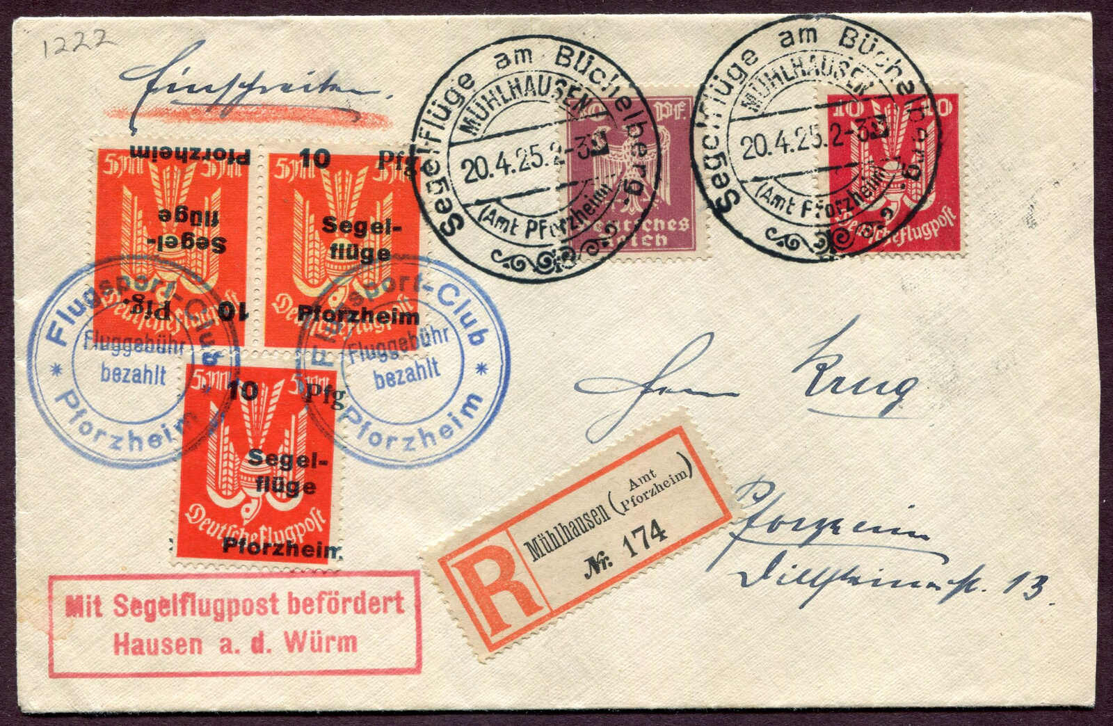 177 CVR   image1925 (April 20), registered glider-mail cover from the Segelflüge am Büchelberg near Pforzheim, bearing black-and-red Mühlhausen (Amt Pforzheim) registration label and boxed red Mit Segelflugpost befördert Hausen a.d. Würmhandstamp, franked at upper right with 10 Pf eagle definitive and 10 Pf airmail issue tied by black triple-circle "Segelflüge am Büchelberg / Mühlhausen (Amt Pforzheim)" (20 Apr) cancellations, additionally franked with three 5 Mark airmail stamps with 10 Pf Segelflüge Pforzheim overprints, the pair with variety overprint inverted, each cancelled by blue double-circle "Flugpost-Club Pforzheim / Fluggebühr bezahlt" strikes, the reverse bearing black double-circle Pforzheim (24 Apr) receiver, a striking and desirable specialised glider-mail franking, very fine. (Mi. 13dk) (Image 1) (Image 2)