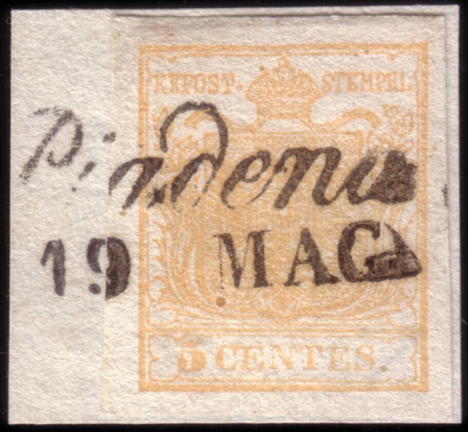5c. giallo tendente al rosaceo, con annullo di Piadena in corsivo