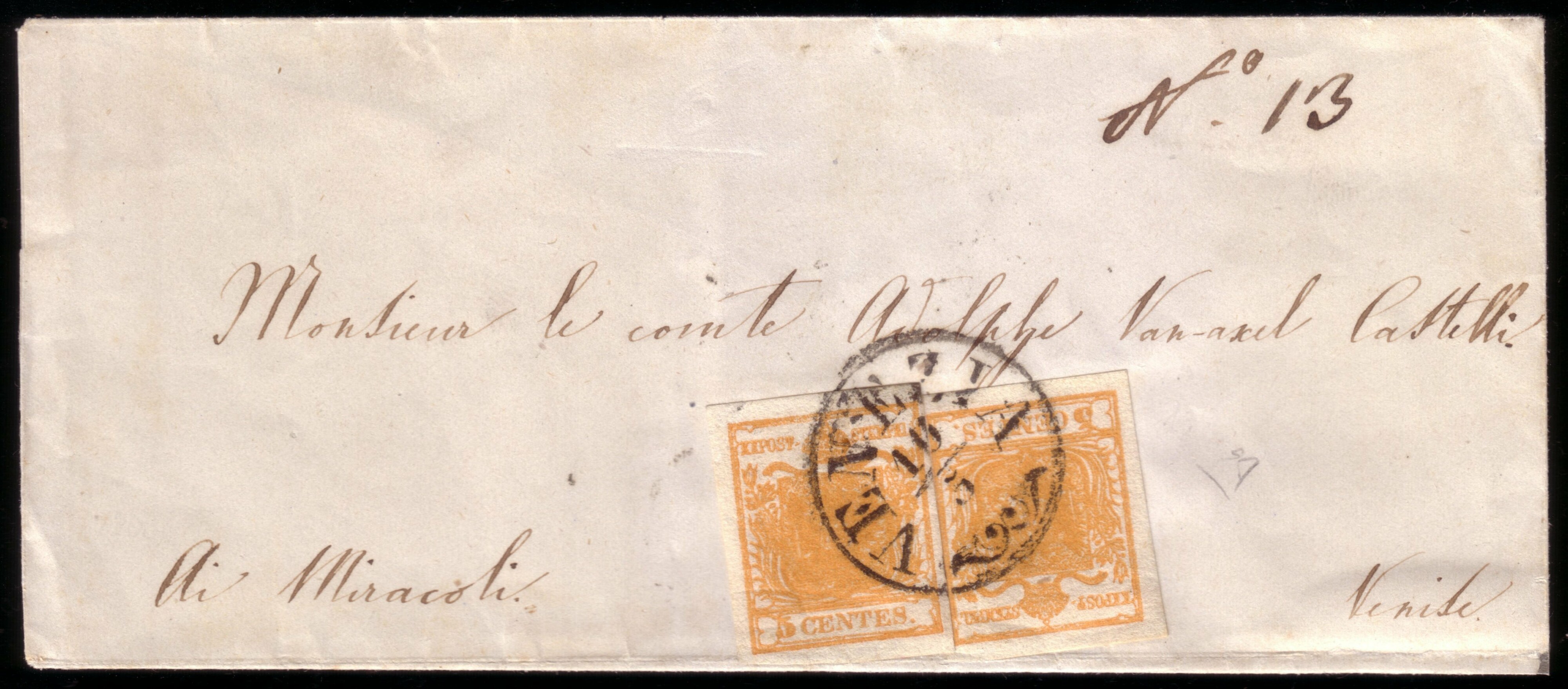 Lettera senza testo da Venezia per Città, affrancata per 10c. con due esemplari del 5c. arancio carico