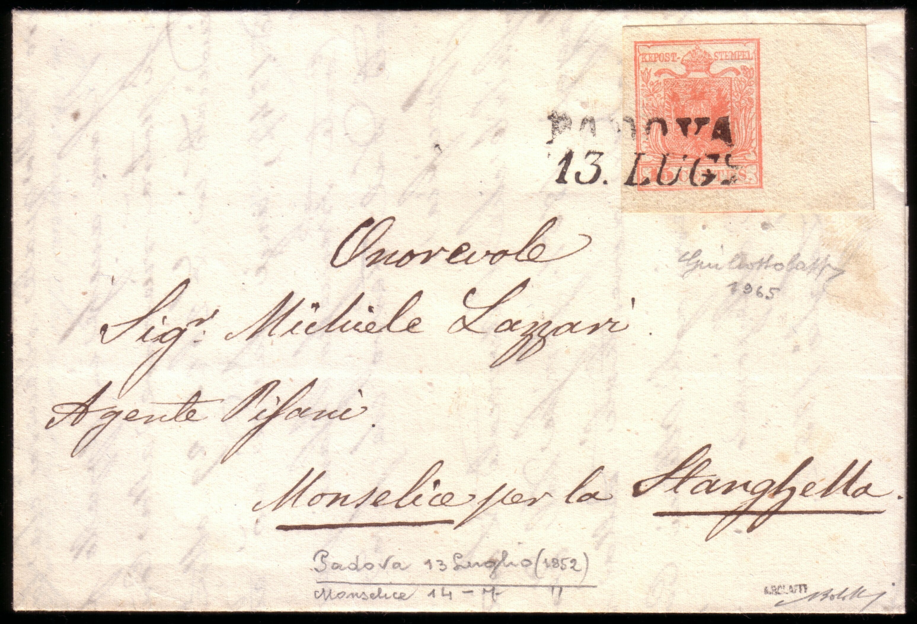Folded letter with text from Padua to Monselice, franked with 15c. intense carmine rose, type II