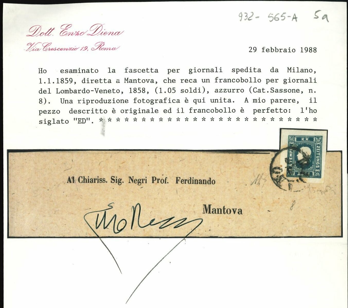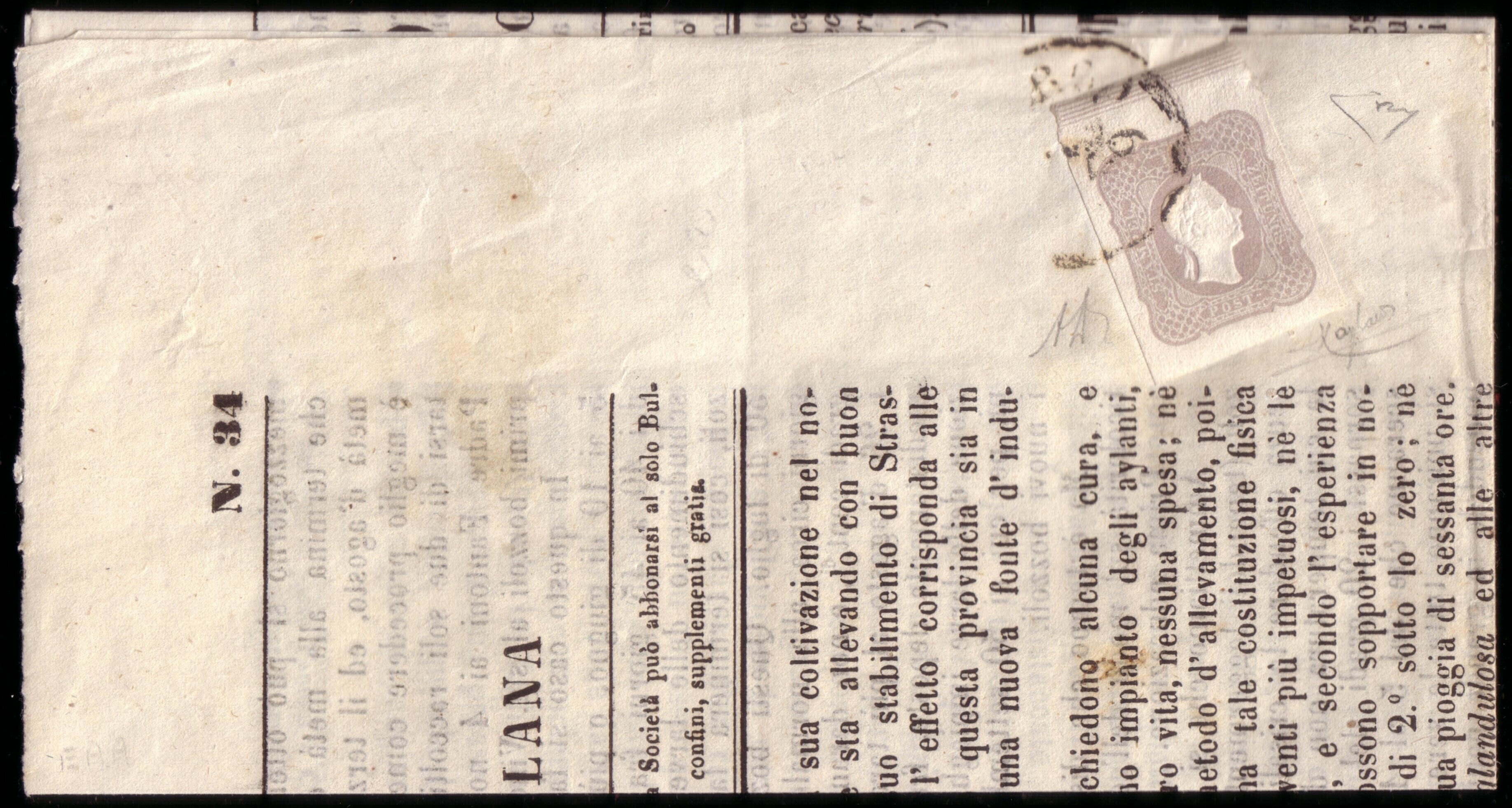 "Bullettino di Udine" newspaper franked with (1.05s.) grey lilac with a large part of the frame line of the plate at the top