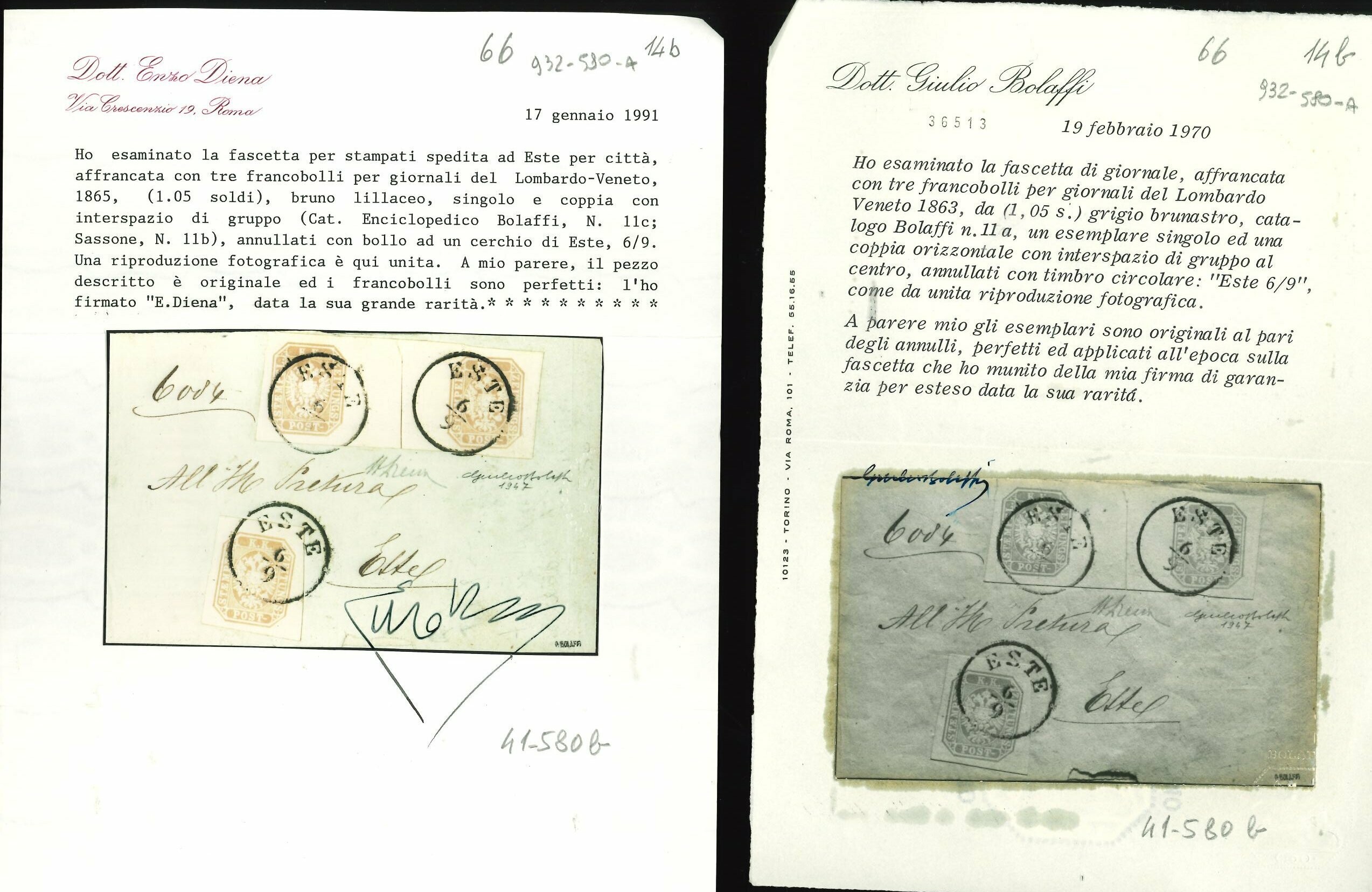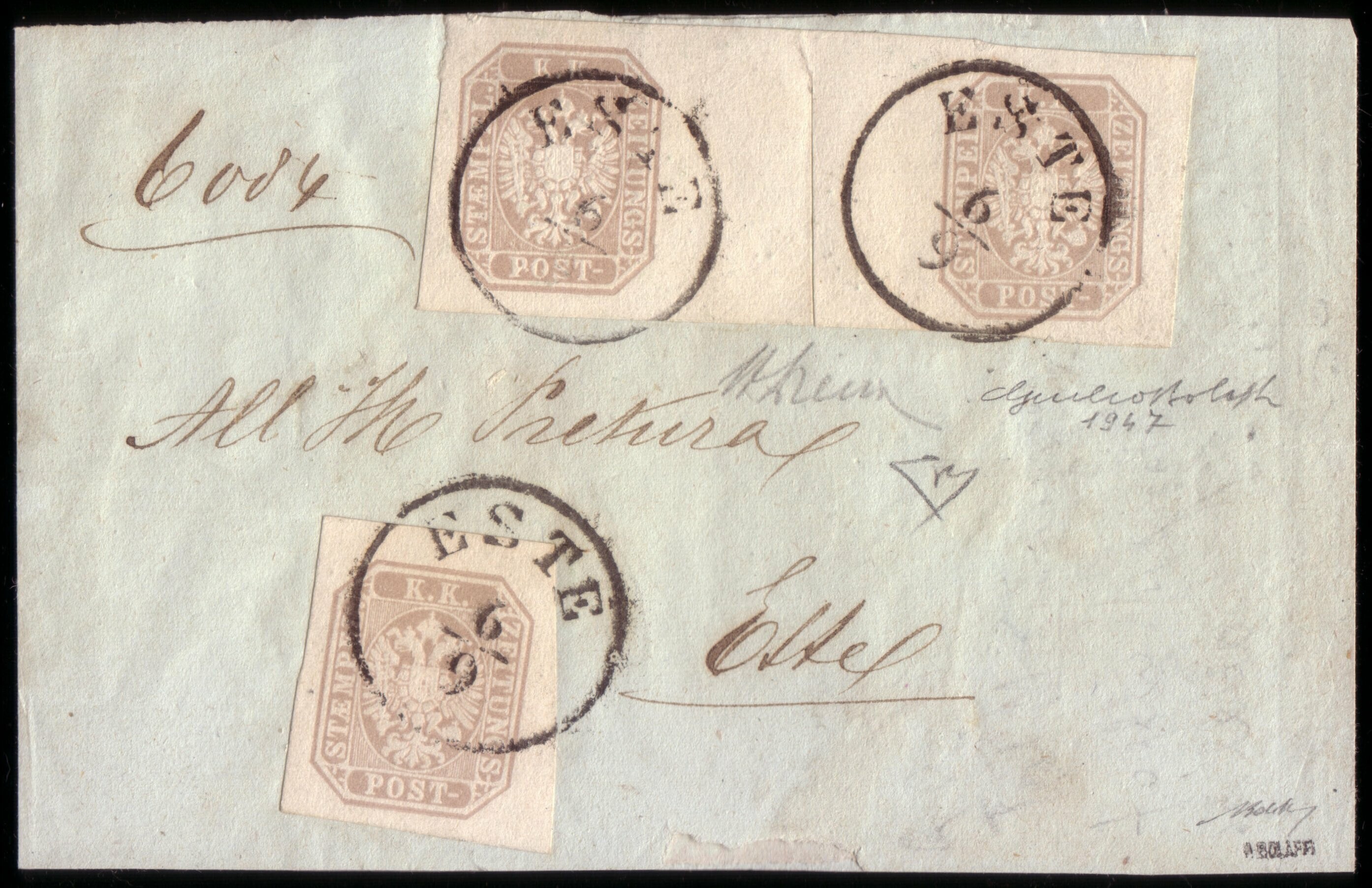 Fascetta da Este per Città, affrancata per (3,15s.) con tre esemplari del (1,05s.) bruno lillaceo di cui una coppia orizzontale con interspazio di gruppo