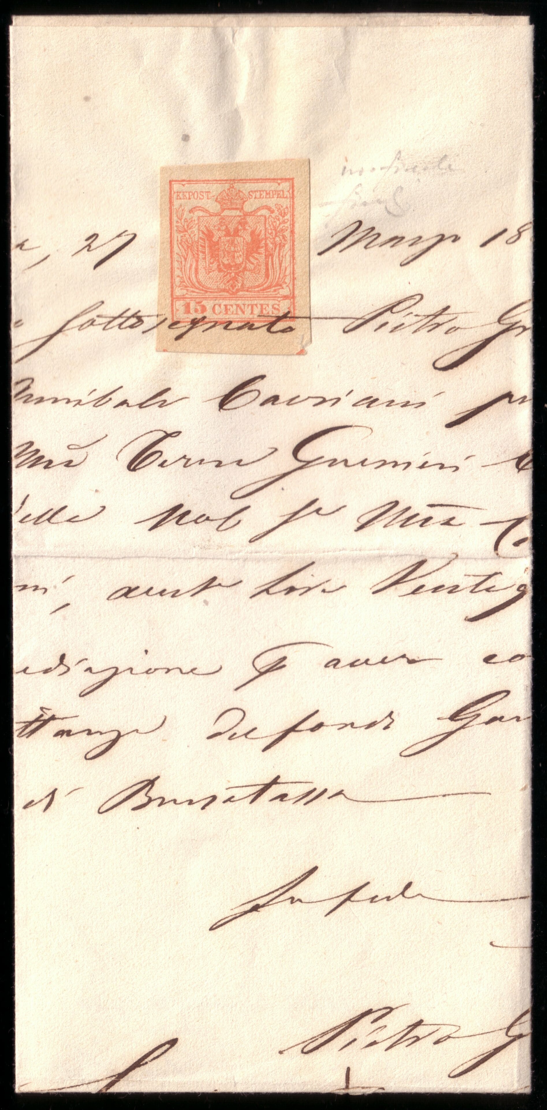 Folded letter with text from Bergamo (mute) to Milan, franked with 15c. red, type I, I printing