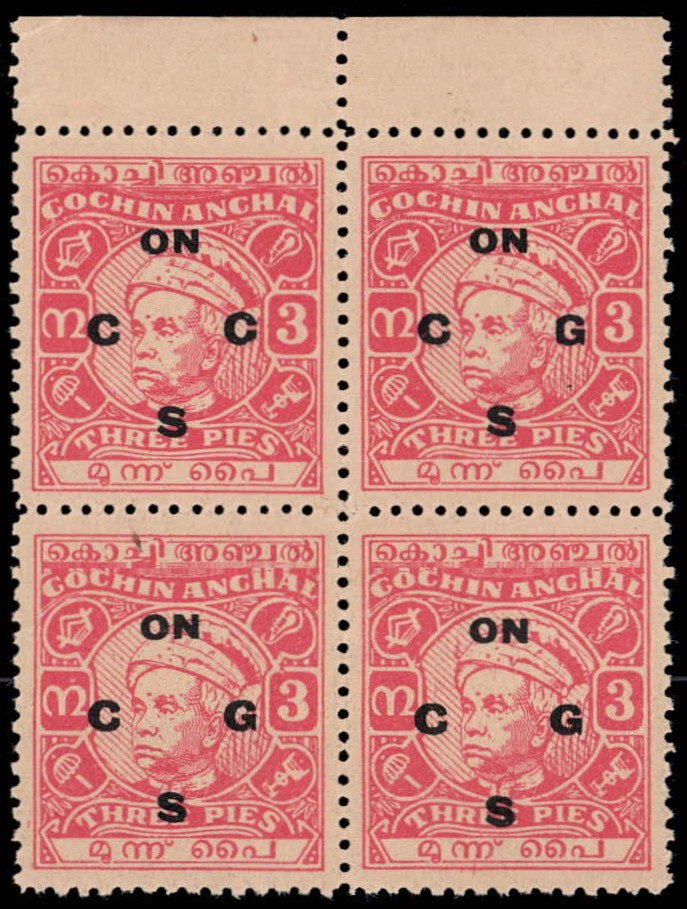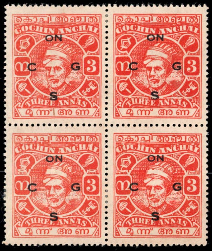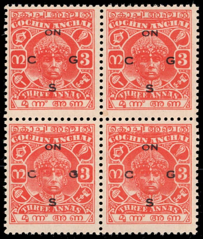 carmine marginal block of 4 with error, top-left stamp with "C" for "G" on ON C G S overprint. Unused without gum as issued (Image)