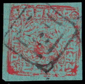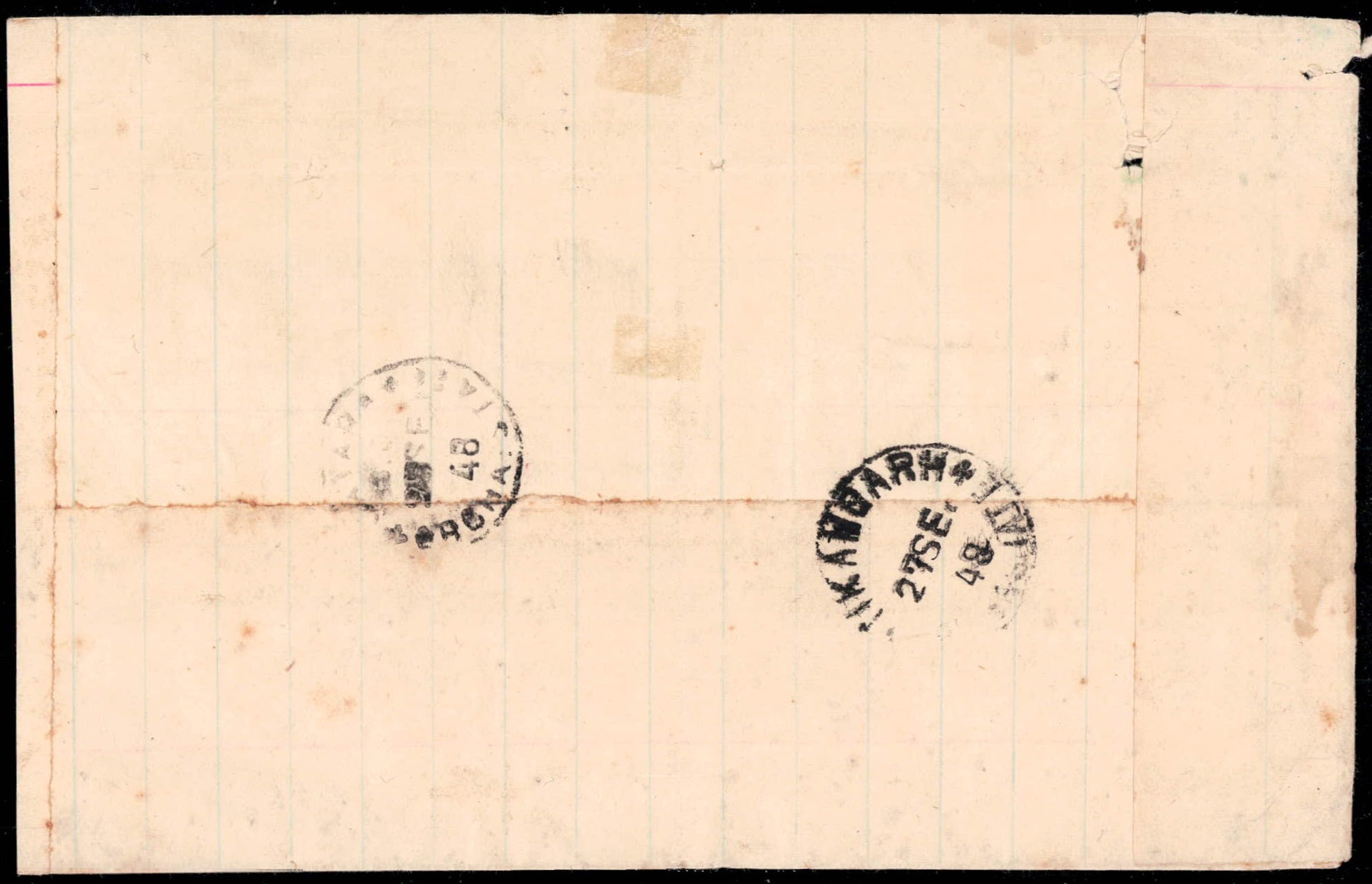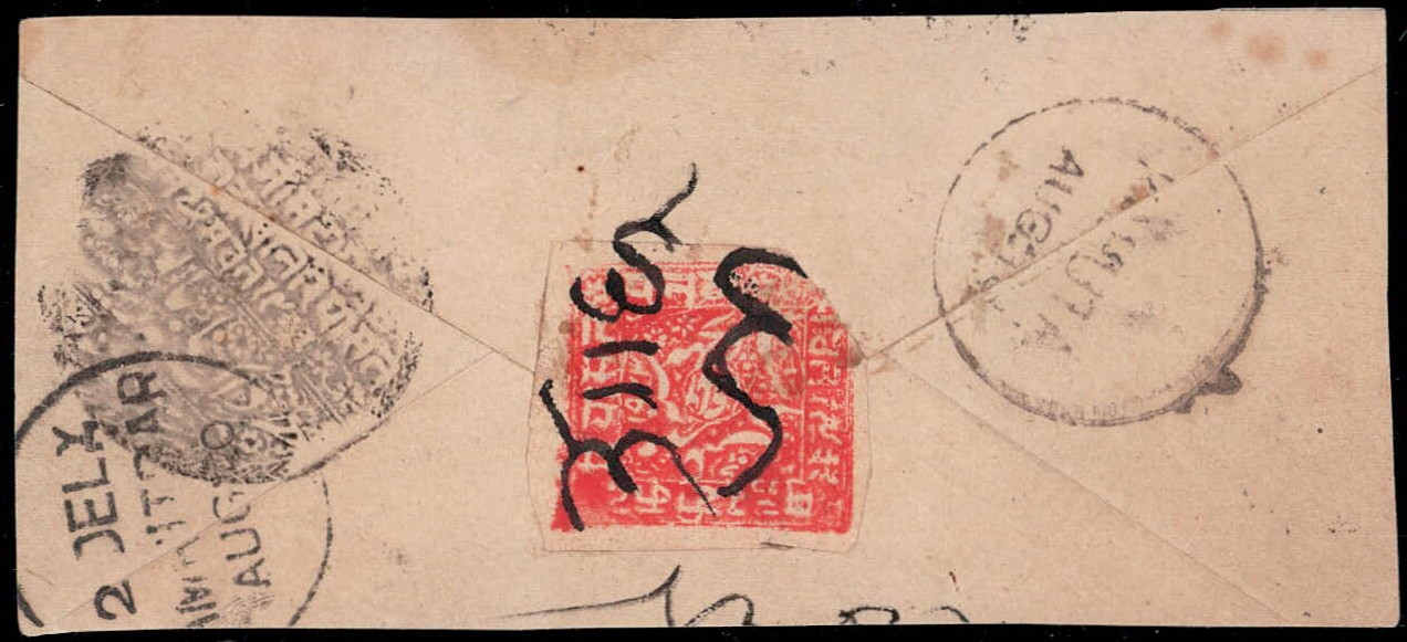yellowish white wove paper used on part cover tied by manuscript cancel, stamp with corner missing, with Poonch native 4 line intaglio seal cancel, Kahuta transit cds and Amritsar delivery cds. Catalog value of stamp alone is £300 (Image)
