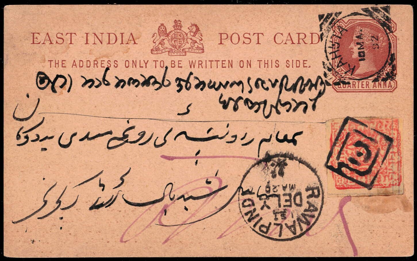 stationery postcard additionally franked with Poonch 1885-94 1p red on yellow wove paper tied by concentric of three squares, indicium canceled by Kahuta Imperial Exchange Office squared circle cancel dated 10 march 1892 with Rawalpindi (present day