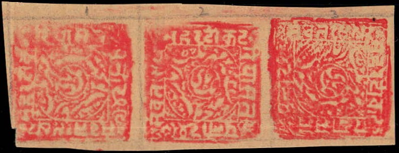 yellow wove batonne paper, strip of three with error, all three stamps printed sideways in relationship to each other. Unused without gum as issued. (Image)