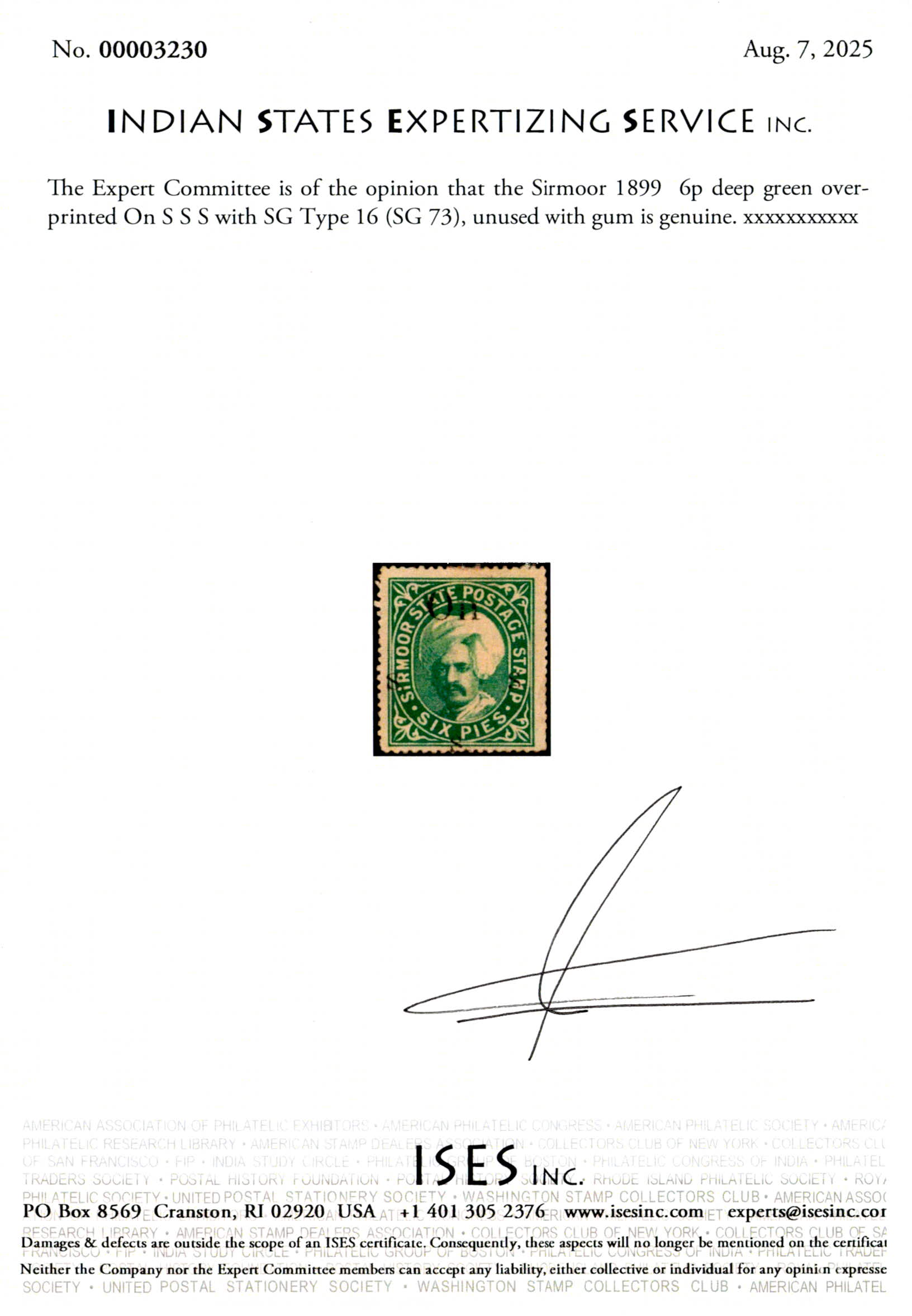 green overprinted On S S S with SG Type 16. Unpriced in mint condition. 2025 ISES certificate. (Image)