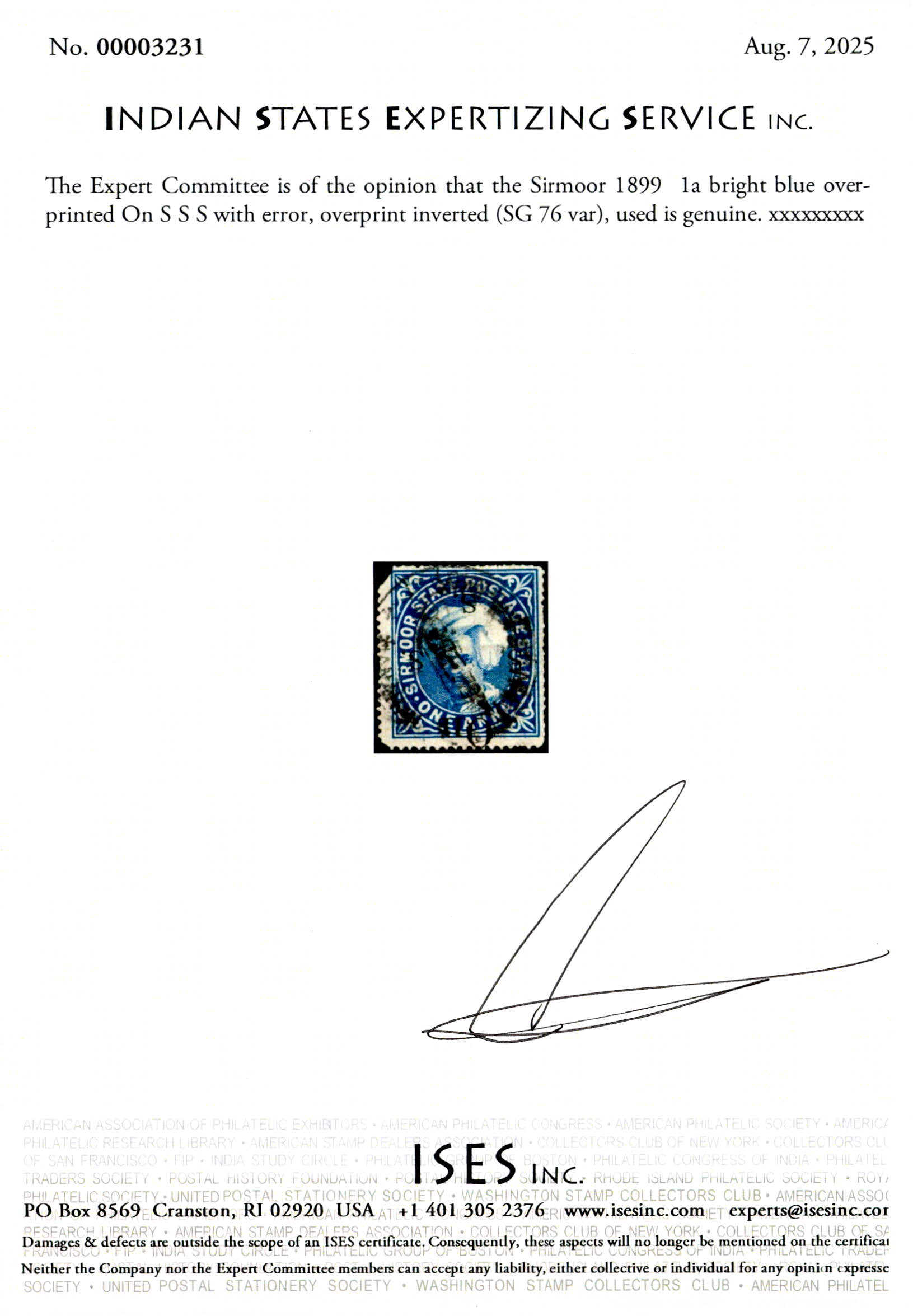 blue overprinted On S S S with error, overprint inverted. Not listed in SG and possibly unique. Catalog value as normal stamp £425. Top left corner missing. 2025 ISES certificate.