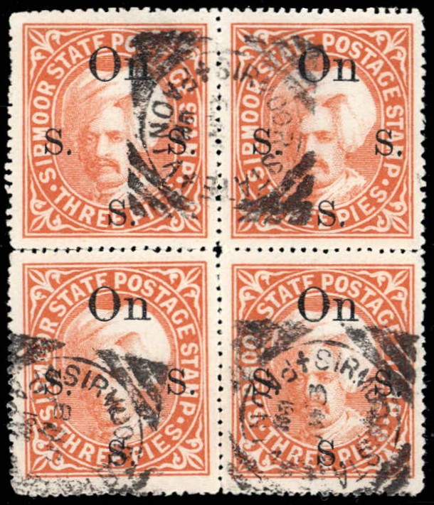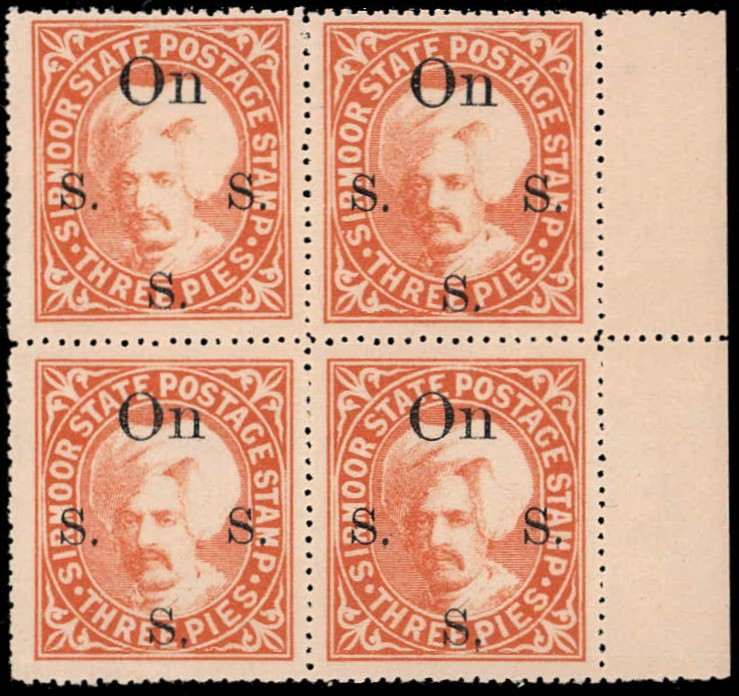 overprinted On S S S with SG Type 18, marginal block of 4. (Image)