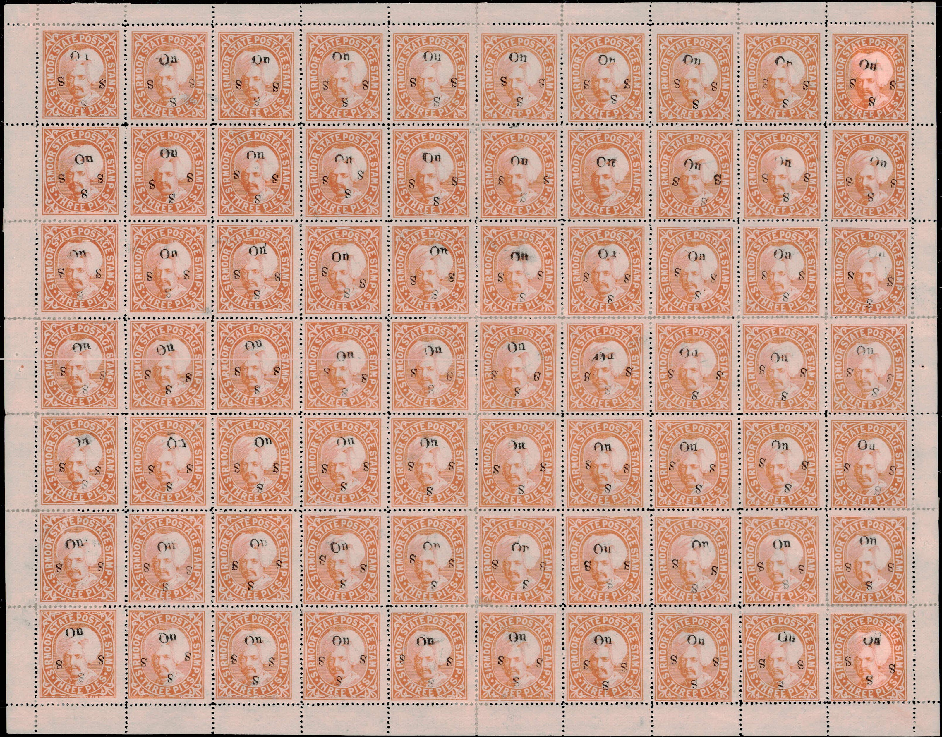 complete sheet of 70 handstamped On S S S with SG Type 19 with error, 'On" only on stamp pos. R 2/7 and bottom "S' missing on stamp pos. R 6/1. Some hinge reinforcements on back.