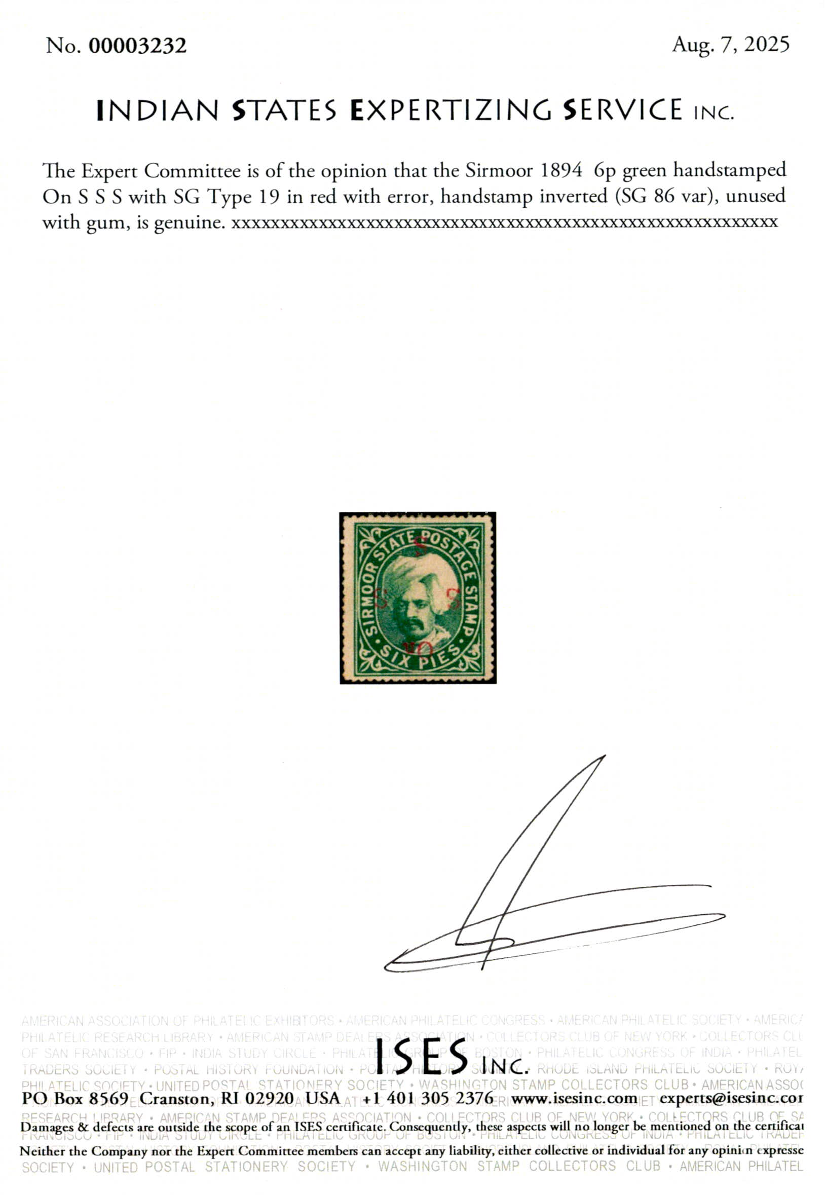 handstamped On S S S with SG Type 19 in red with error, handstamp inverted, not listed in SG. Minute tear on left. 2025 ISES certificate (Image) (imagea)