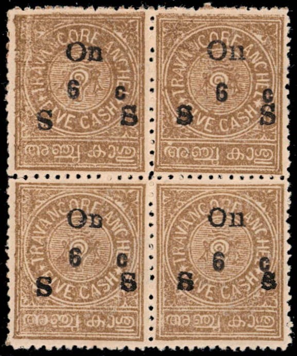 olive-bistre block of four overprinted On S S surcharged 6c with error, stamp 1 and 3 with first "S" inverted. Unused without gum as issued (Image)