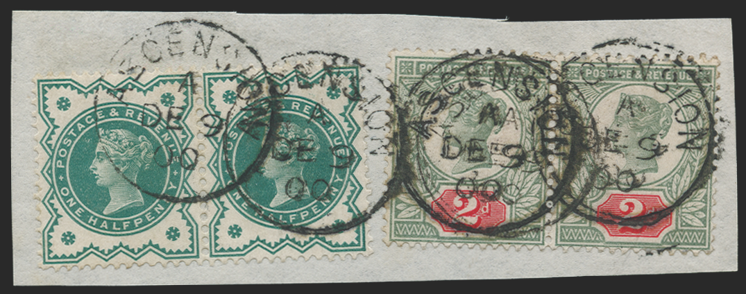 Ascension 1900 (DE 9) piece with 1887-92 GB 2d green and carmine and 1900 GB ½d blue-green, horizontal pairs, tied by individual strikes of type Z2 circular date stamps (22m, code 'A'), SGZ10/19.