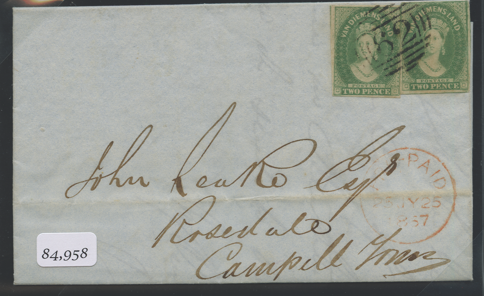 Australia Tasmania 1857 (JY 25) entire letter from Hobart to 'Campbell Town', franked at 4d inland rate by 1856-57 2d dull emerald-green on thin white paper (no watermark), SG20.