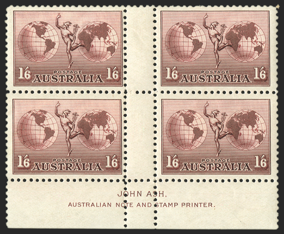 Australia 1934-48 "Hermes" Airmail 1s6d dull purple, no watermark, perforations 11, interpane block of 4 with 'JOHN ASH' imprint, upper left stamp showing variety 'Retouched shading to top left of right hand globe', SG153/var.