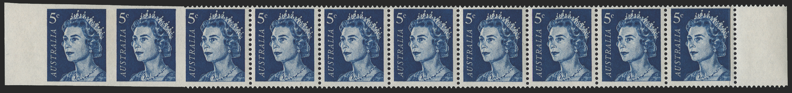 Australia 1966-73 5c deep blue, horizontal strip of 10, the left pair ERROR IMPERFORATE, SG386c/cb.
