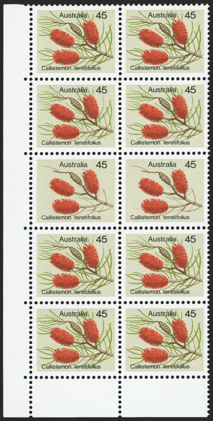 Australia 1975 45c 'wild flowers' ERROR YELLOW-GREEN (TWIGS) OMITTED lower left corner block of 10 (2x5), middle row showing error, SG609b.