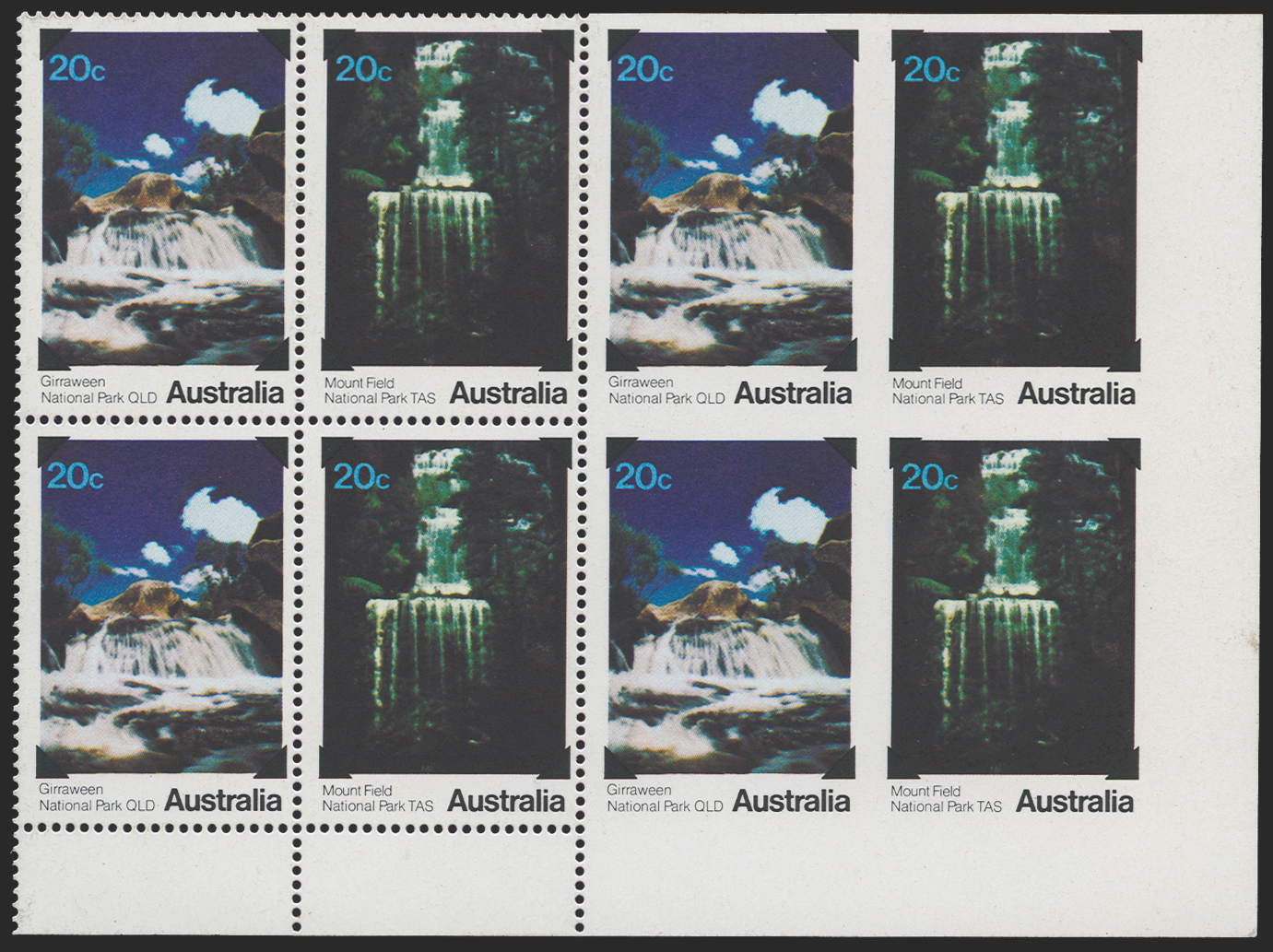 Australia 1979 National Parks 20c 'Girraween' and 'Mount Field', SG713a/ab, lower right corner block of 8 comprising four se-tenant horizontal pairs, THE RIGHT HAND BLOCK OF 4 ERROR IMPERFORATE (except at left).